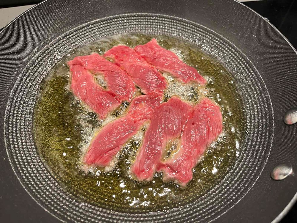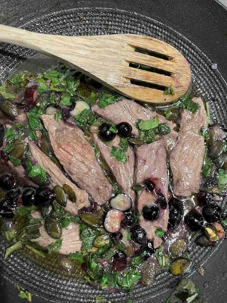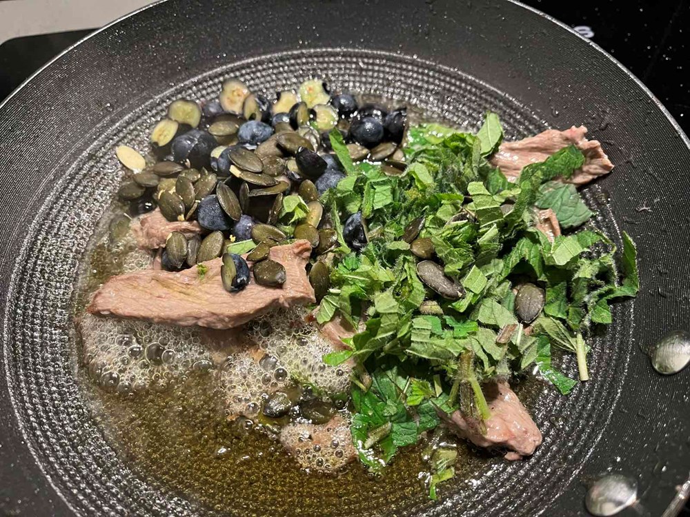 U tavi na vrelom maslinovom ulju pržiti trakice ramsteka cca 40-ak sekundi sa svake strane. Nakon toga smanjiti temperaturu prženja pa dodati svježu borovnicu razrezanu na polovice, listove svježe mente narezane na trakice i dvije jušne žlice bučinih sjemenki. Posoliti sve s trećinom čajne žlice cvijeta morske soli pa sve to pržiti minimalno još jednu minutu a maksimalno dvije minute. Nemojte dulje od dvije minute.