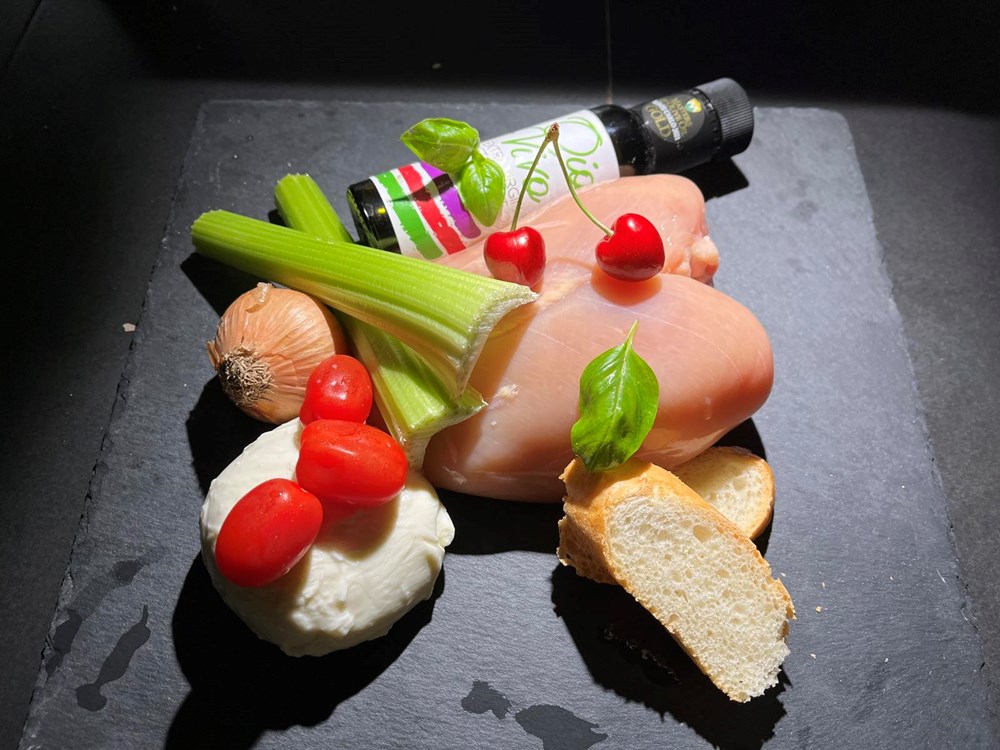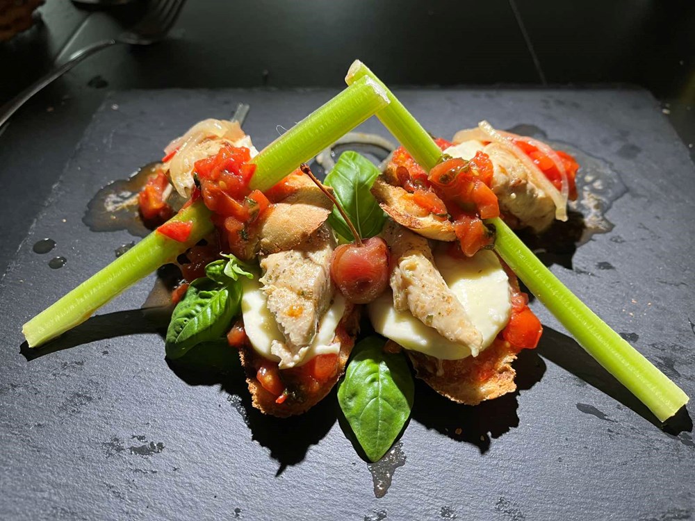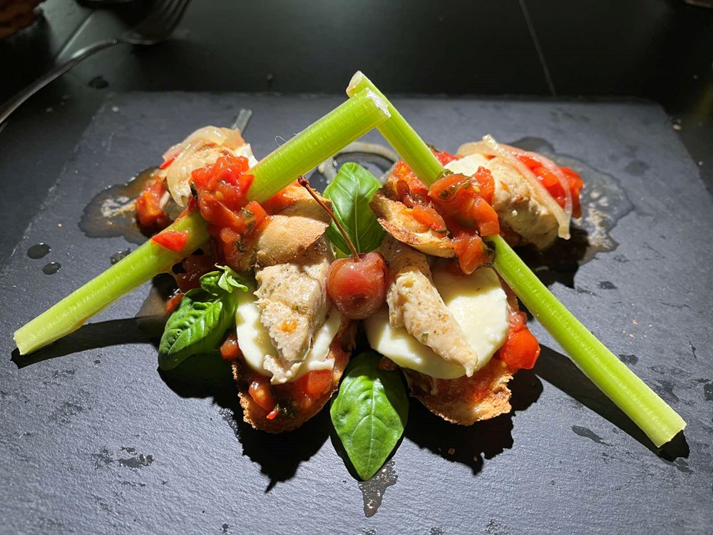 Narežite mozzarellu na tanke fete. Na velikom ravnom tanjuru prvo postavite kruh. Na kruh stavite šalšu, pa narezanu mozarellu, na mozarellu stavite piletinu pa zatim prelijte našom domaćom šalšom, po svemu pobacajte tri do četiri lista svježeg bosiljka stavite dvije trešnje koje ste također pekli u dubokom maslinovom ulju, pa posložite stabljike svježeg celera preko svega…
