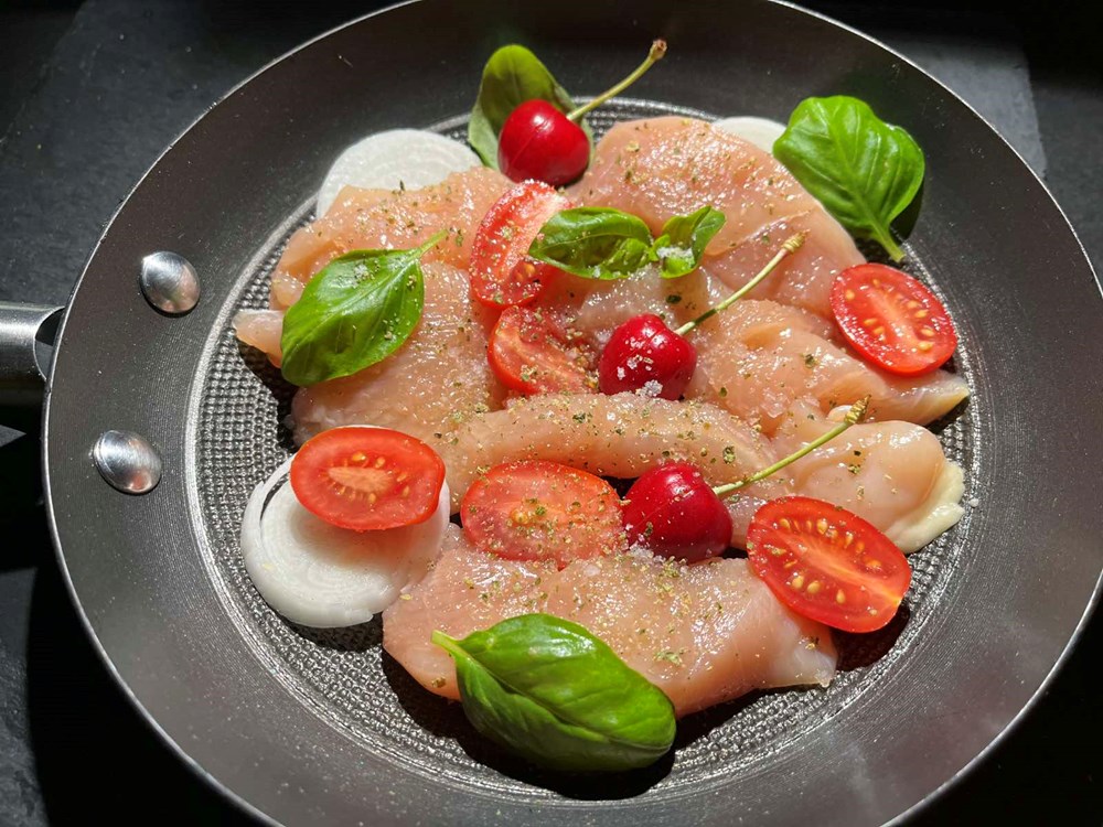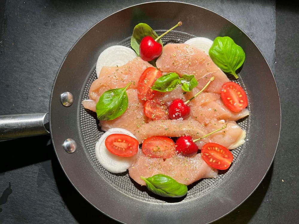 Glavicu luka narežite na kolutiće, plod svježe trešnje zarežite nožem na dva mjesta, cherry pomidore oštrim nožem narežite na polovice, pileća prsa razrežite na trakice debljine malog prsta, ako ste Frankenstein, Kiklop, Troll ili neka vrsta diva onda znatno tanje od vašeg malog prsta.