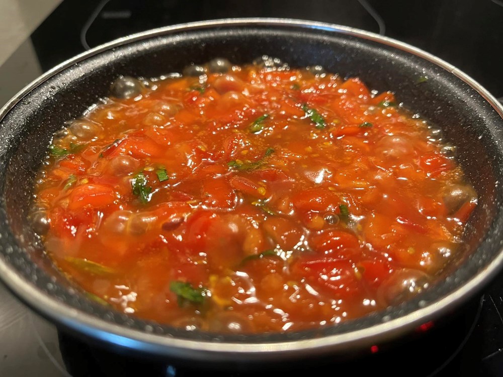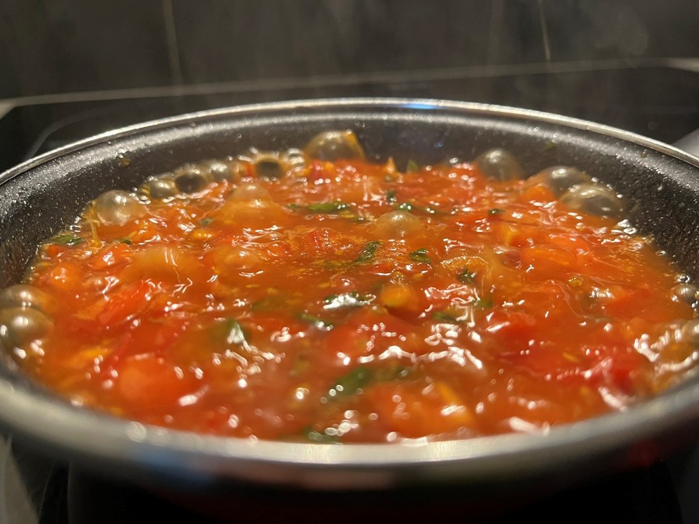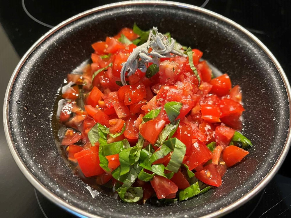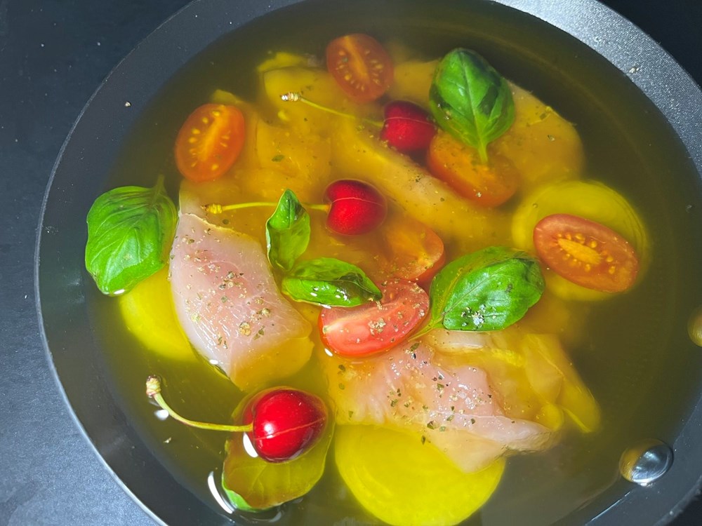 Nakon toga izvadite zdjelu s piletinom iz pećnice. U drugu plitku tavu na zagrijanom maslinovom ulju uz konstantno miješanje pržite cherry pomidor na sitno nasjeckan, čajnu žličicu meda, 5 listova bosiljka narezanog na trakice, jedan do dva lista lavande, prstohvat zelenog friško samljevenog papra, prstohvat cvijeta morske soli. Nakon jedne minute prženja i konstantnog miješanja dodajte 0,2 dcl vode. Pržite tako uz miješanje još nekih maksimalno 2 minute, pa maknite s izvora topline.