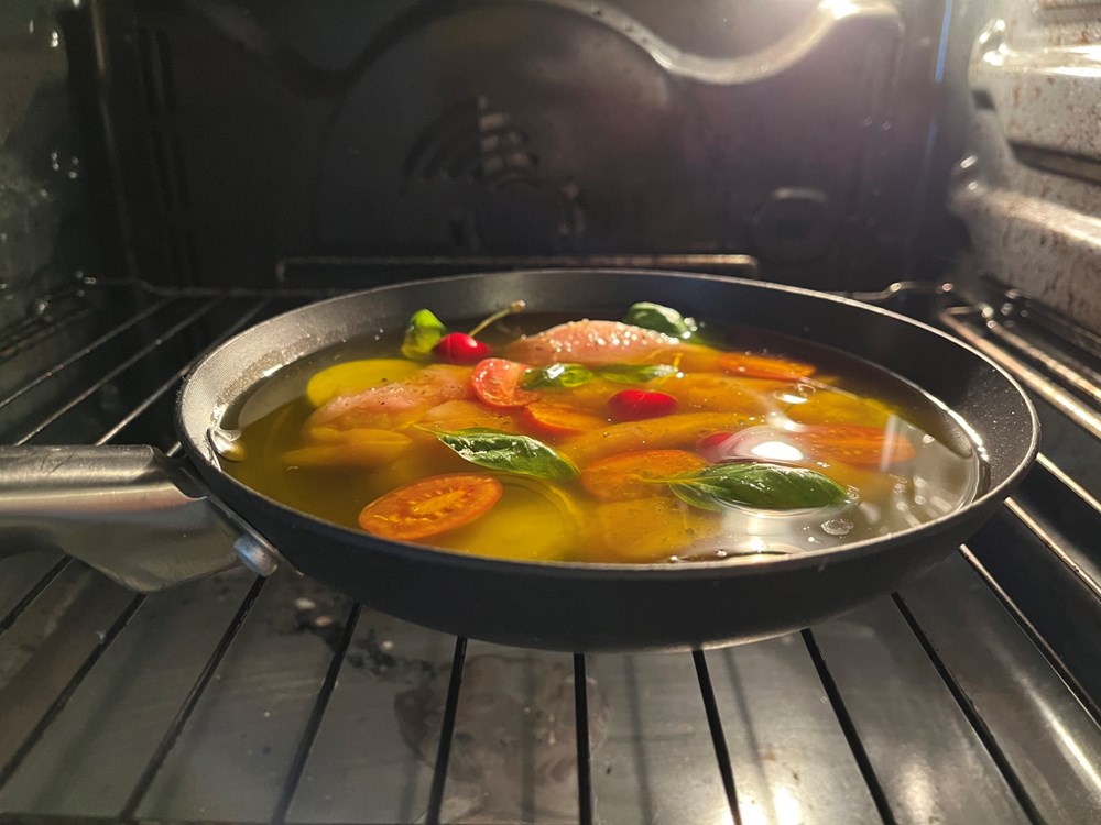Dodajte prstohvat soli i prstohvat crnog papra. Sve to stavite u metalnu tavu ili u manju posudu za pečenje. Ubacite po svemu 5 do 7 svježih listova bosiljka te sve prelijte maslinovim uljem da navedene namirnice budu preplavljene uljem ispod površine. Stavite zdjelu u pećnicu na 100 stupnjeva Celzijusa nek se peče cca 1 sat i 10 minuta do maksimalno 1 sat i 20 minuta.