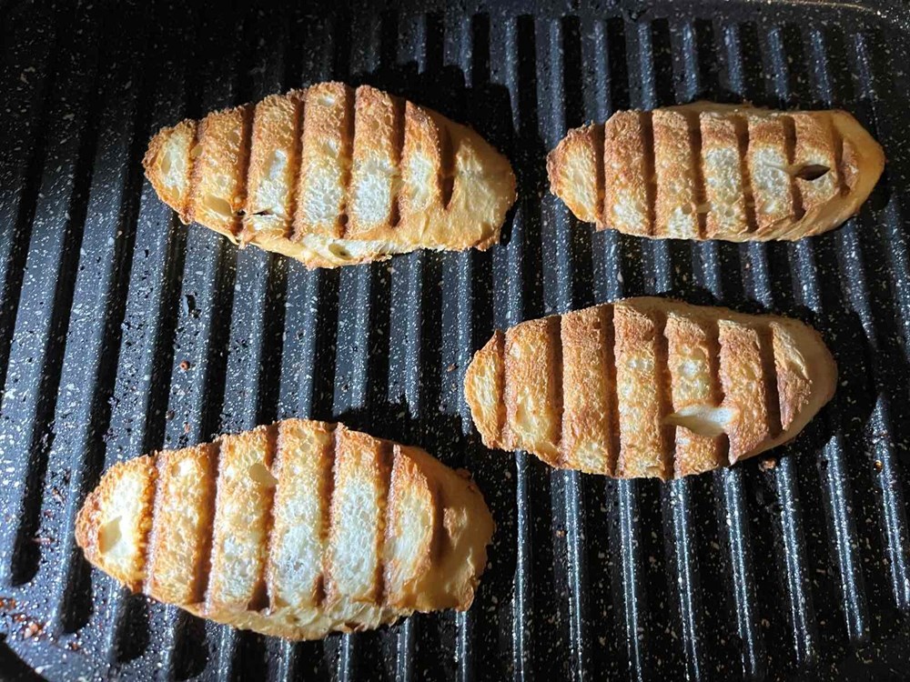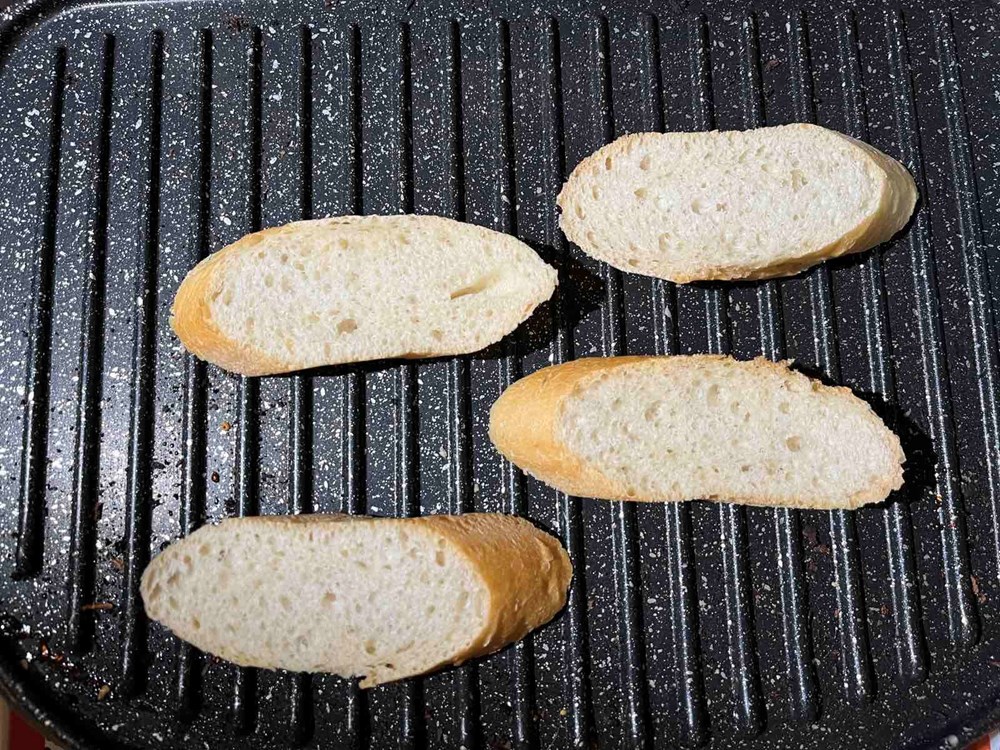 Izrezane fete francuskog kruha ili baguettea stavite u toster pa ih istostirajte dok ne dobiju tamno smeđe pruge po sebi .