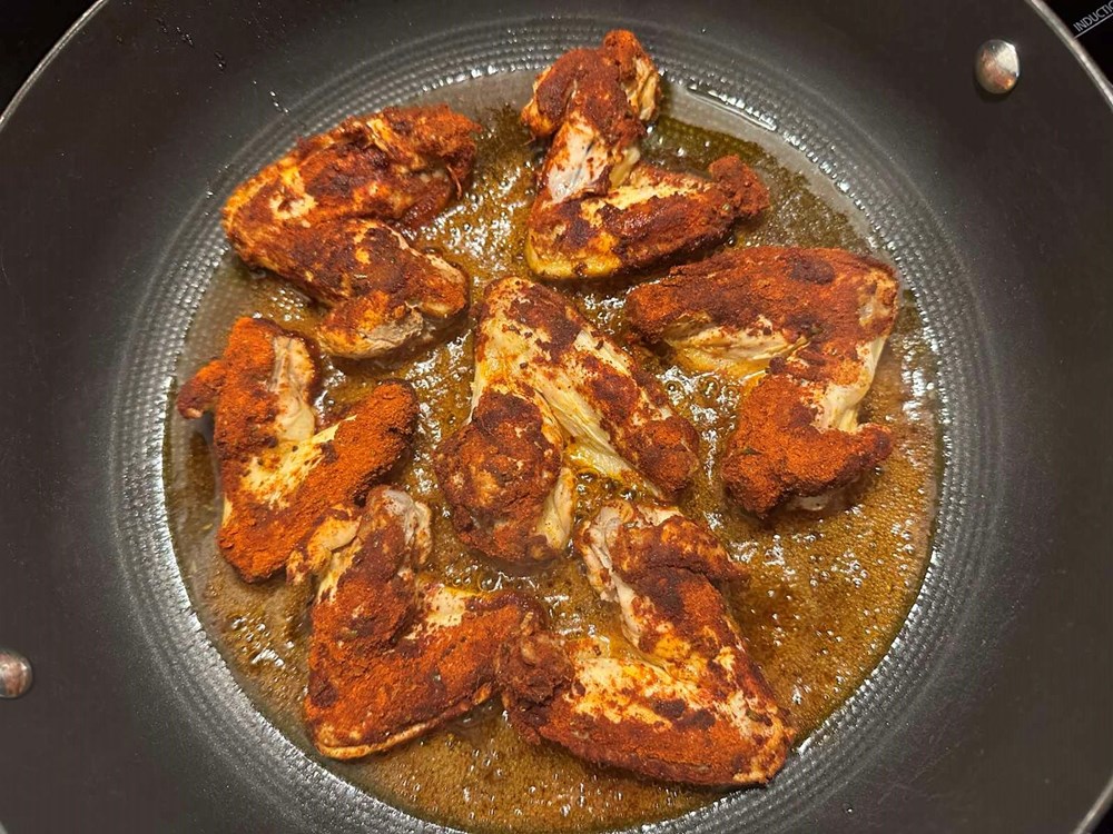 U manji lonac sa kipućom slanom vodom stavite kuhati pileća krilca. Ubacite unutra i desetak listova svježeg lovora. Nakon desetak minuta izvadite krilca iz kipuće vode, pa ih uvaljajte u smjesu dimljene paprike u prahu, sitno nasjeckanih svježih grančica ružmarina s pola žličice crnog friško samljevenog papra i jednom čajnom žličicom cvijeta morske soli.