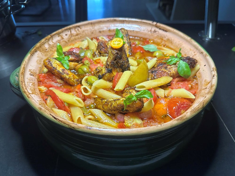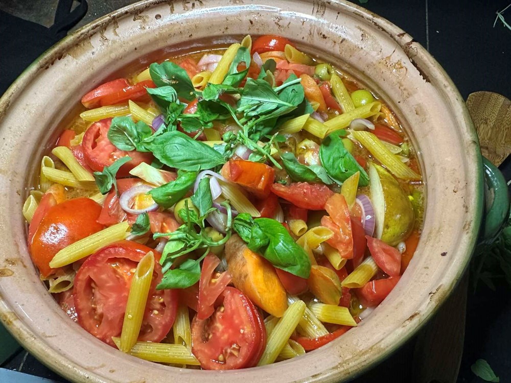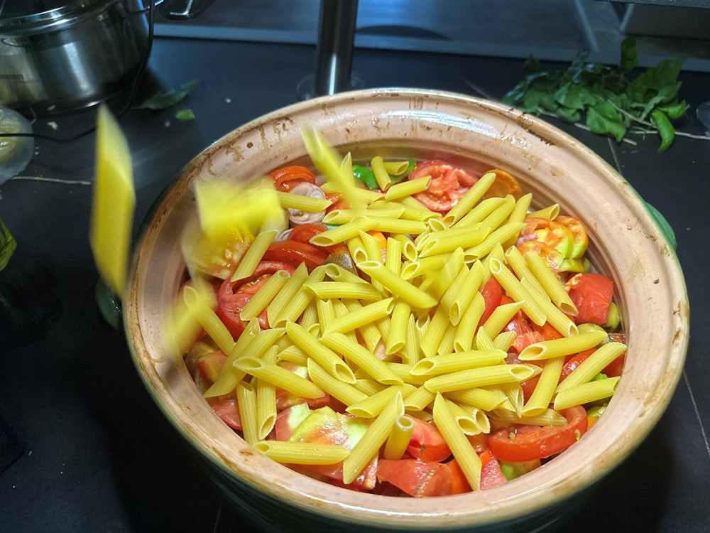 Sve ovo unutar pekača dobro izmiješajte, poklopite poklopcem pa stavite u zagrijanu pećnicu na 190 stupnjeva Celzija da se peče nekih 50-ak minuta. Nakon 50-ak minuta otvorite poklopac pekača iliti zdjele u kojoj pečete povrće pa ubacite unutra tjesteninu penne No 73, dobro izmiješajte pa poklopite posudu da se peče još nekih petnaestak minuta.