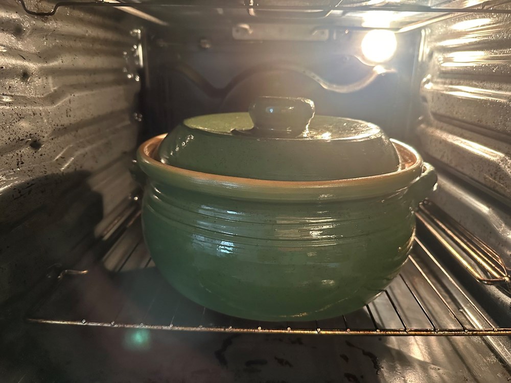 Nakon petnaestak minuta otklopite poklopac ubacite desetak listova svježeg bosiljka i još jednu žlicu maslinovog ulja sve to lagano pomiješajte pa pecite na 190 stupnjeva još nekih deset minuta. Po isteku vremena izvadite iz pećnice.