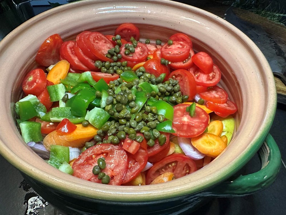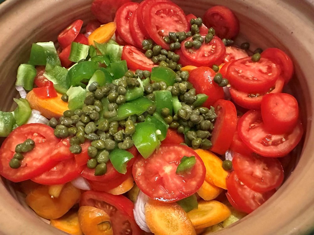 U keramički pekač (može i stakleni ili metalni) na dno stavite prvo maslinovo ulje zatim pomidor razrezan na kolutiće, papriku na kockice, mrkvu na kolutiće, luk na kolutiće dodajte pola čajne žličice cvijeta morske soli, jednu jušnu žlicu livadnog meda i pola žličice crnog friško samljevenog papra.