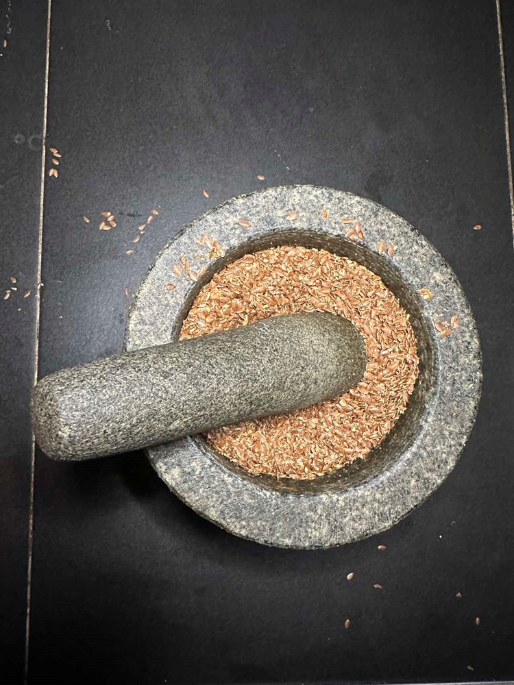 Dakle vratimo se u dobru staru zbilju i nastavimo s opisom ovog jela: kada se sadržaj zdjele iz "škrinje" otopio nastavljamo s akcijom … Dakle … u mužar stavimo 5 jušnih žlica sjemenki od Lana i ručni ih zdrobimo (ako vam se to ne da i ljubitelj ste električne energije, možete ih ubaciti u električni mlinac za kavu), zatim mužar s zdrobljenim sjemenkama ostavimo po strani, one će nam zatrebati kasnije.