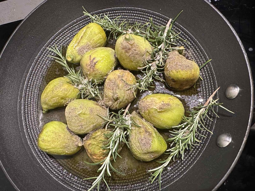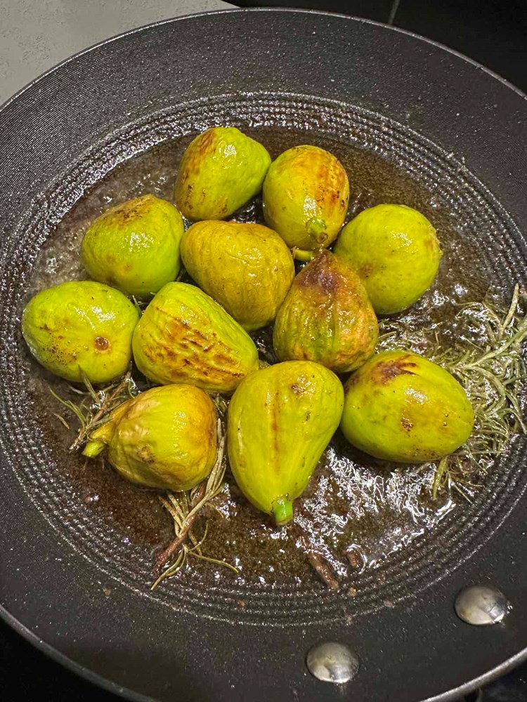 U plitku tavu na vrelome maslinovom ulju stavimo pržiti smokve na koje smo bacili pola čajne žličice crnog friško mljevenog papra, pola čajne žličice cvijeta morske soli i pet grančica ružmarina. Smokve pržimo po cca tri minute sa svake strane sve dok lagano ne porumene. Stavimo ih zatim izvan izvora topline.