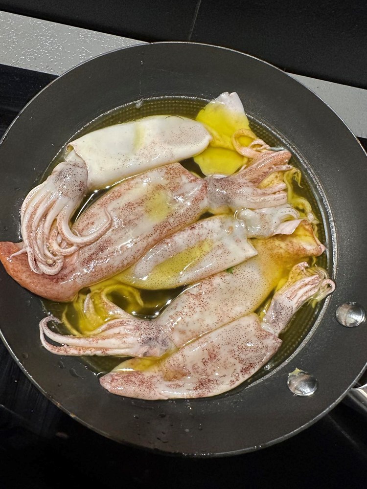 U drugu plitku tavu, na vrelome maslinovom ulju s limunovim sokom i začinima u kojemu su bile zamrznute stavimo pržiti jadranske lignje, onako "al šporko" neočišćene… nakon što smo ih pržili 3 do max četiri minute sa svake strane maknemo tavu s izvora topline. Sada jedino što ćemo odstraniti iz lignje je ona "plastična" kost koja sada lagano viri između glave i tijela. Uzmite kuharsku pincetu ili jednostavno prstima vlastite ruke Odstranite istu.