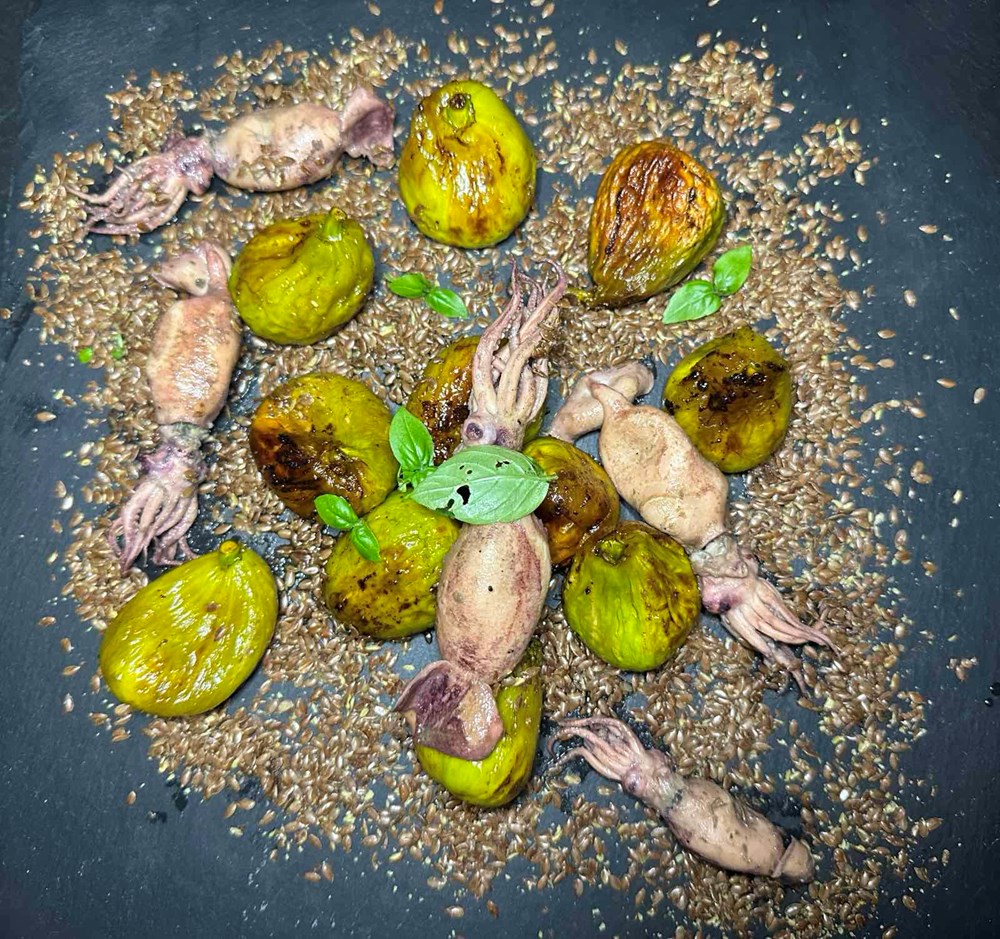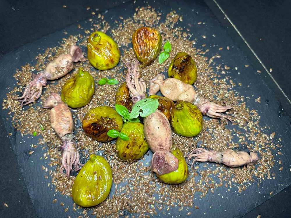 Na velikom ravnine tanjuru "pobacajte" da izgleda poput pjeska izmrvljene sjemenke od lana. Po njima postavite naše pržene smokve da izgledaju kao nekakvo kamenje oblutci na morskome dnu. Po smokvi i između njih postavite nesimetrično naše lignje, možete staviti i par vrlo sitnih ako ih prinađete listova bosiljka koji su tek proklijalo iz stavljike kao nekakvo morsko raslinje … i to je to … dobili ste priču koju valja pojesti i uživati u svim guštuma "Sinje Adrije" i mediteranskog vrta pritom…