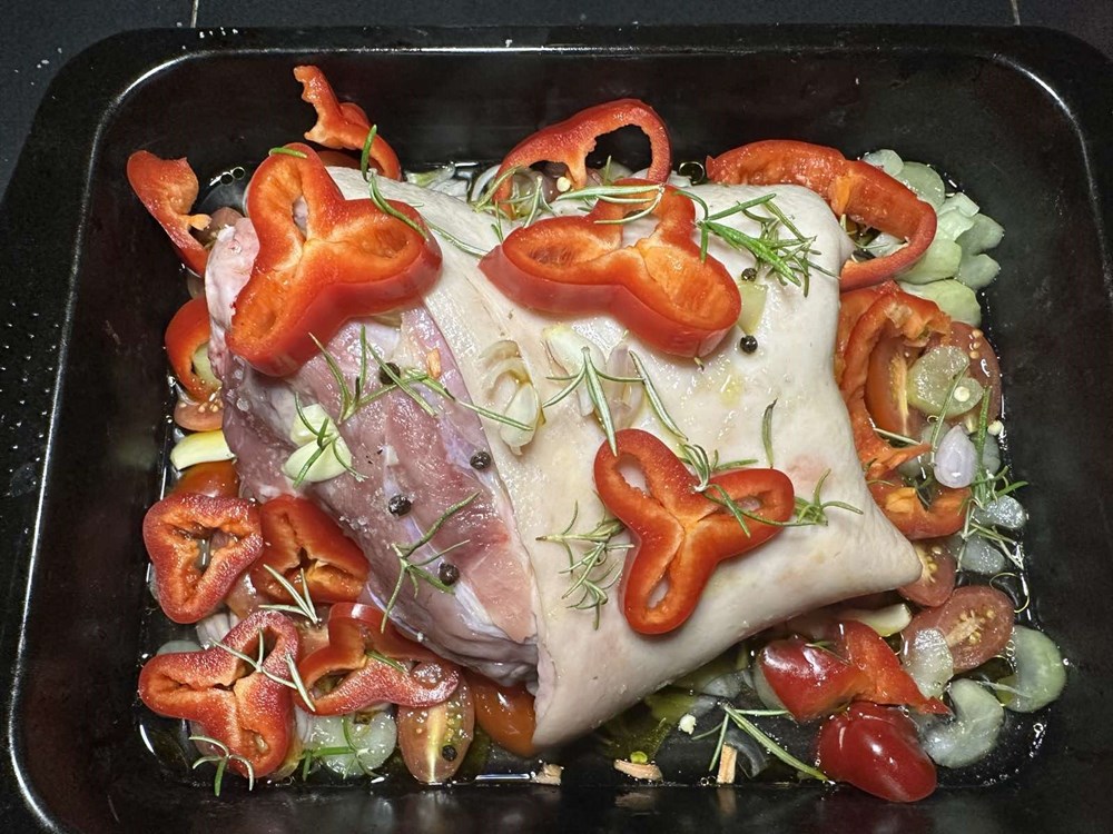 Koljenicu premazati maslinovim uljem pa utrljati cvijetom morske soli. Zatim s ostatka ružmarinovih grančica uklonite iglice te ih pobacajte po svinjskoj koljenici. Izrežite crvenu papriku baburu na tanke kolutiće i pobacajte ju po svinjskoj koljenici i oko nje po zdjeli za pečenje. Isto tako narežite na tanko stabljiku celera te pobacajte komadiće po zdjeli u kojoj ćemo peći našu koljenicu.