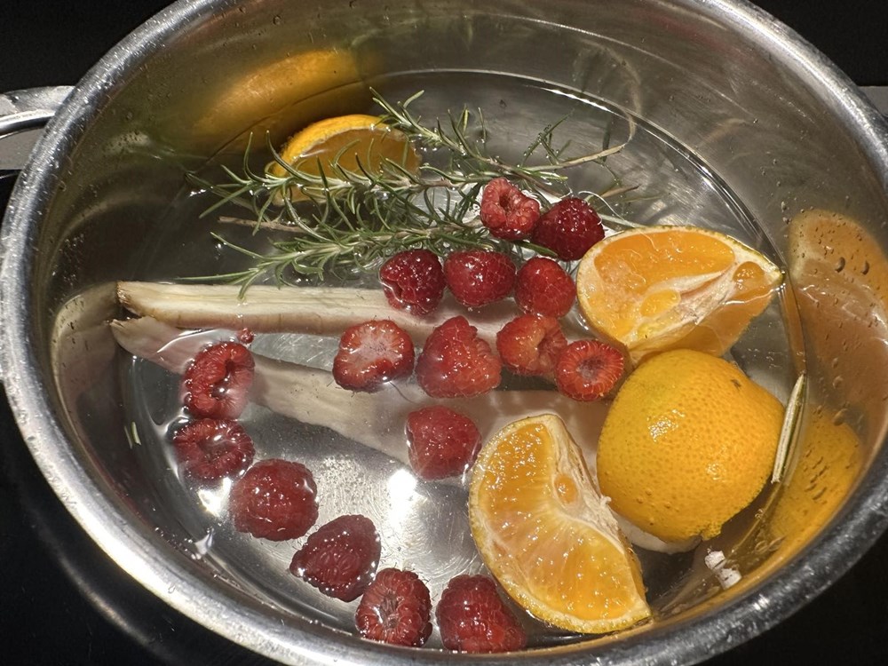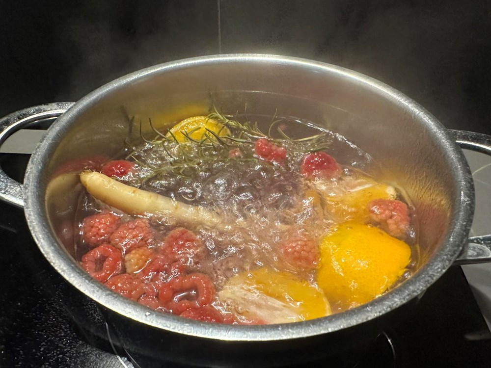 Paralelno kada ste stavili u pećnicu koljenicu u manji lonac s kipućom slanom vodom ubacite korijen celera razrezan uzduž na pola, jednu mandarinu razrezanu na četvrtine, 6 do 7 svježih malina i grančicu ružmarina. Kuhajte tako desetak minuta pa maknite zatim s izvora topline.
