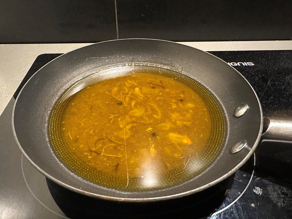 Izvadite koljenicu iz pećnice, a zatim izdvojite sokove koje je pustila tijekom pečenja te ih prebacite u manju plitku tavu. Koljenicu udaljite iz ove priče, ona vam više ne treba, znam da je to težak i emocionalan trenutak, ali tijekom pečenja uzeli smo joj dušu i ona se sada nalazi u onoj tekućini, sokovima koje je pustila tijekom pečenja u manjoj tavi na vašem šporetu.
