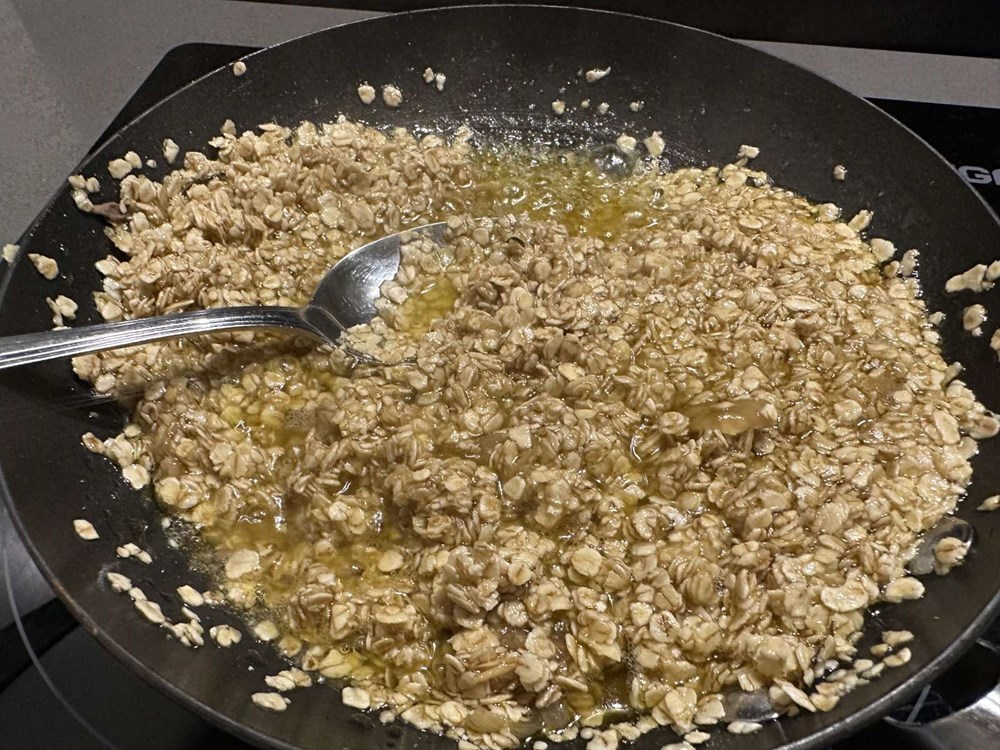 Stavite tavu sa sokovima iliti esencijom koljenice na izvor topline, i kad se sokovi počnu lagano dimiti, u tavu dodajte cca 30-ak dkg zobenih pahuljica, pa uz konstantno miješanje kuhajte tako nekih pet minuta, sve dok smjesa ne postane gusta i kompaktna. Tavu zatim maknite s izvora topline.