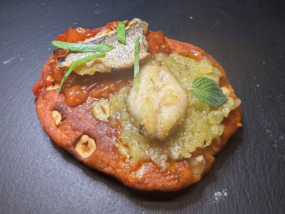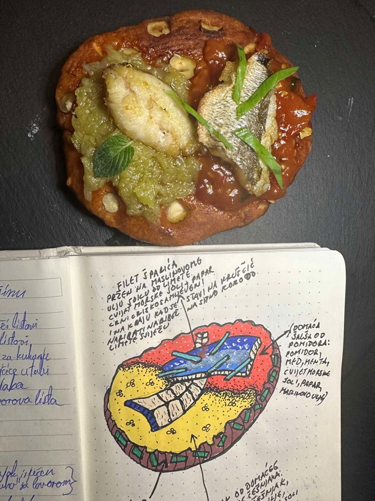 Na plitki ravan tanjur stavite prženi kušinić - pogačicu od krumpira i lješnjaka. Na jednu polovinu kušinića namažite umak od češnjaka i bijele čokolade, a na drugu polovinu nanesite domaću šalšu od pomidora. Tamo gdje je namazan umak od češnjaka okrenite filet ribe s kožom prema dolje, a tamo gdje je šalša od pomidora s kožom prema gore… Po svemu pobacajte nekoliko listića svježeg bosiljka narezanog na trakice.