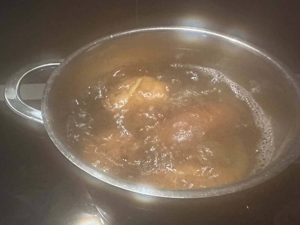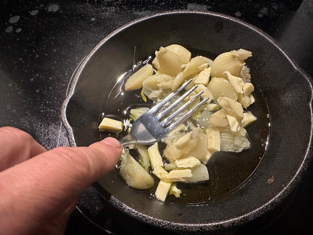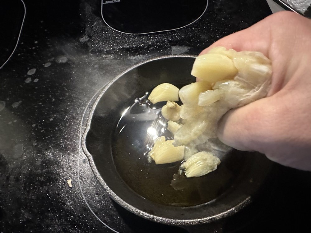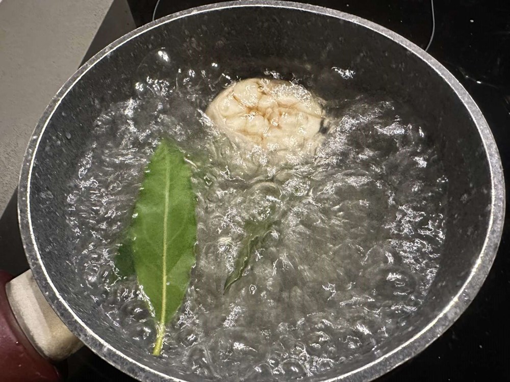 U manji lonac, u kipuću slanu vodu, ubacite cijelu glavicu češnjaka sa korom kojoj ste prethodno odsjekli otprilike četvrtinu gornjeg dijela. Uz tu glavicu češnjaka u kipuću vodu ubacite i tri svježa lista lovora. Nakon 10 do 12 minuta kuhanja izvadite češnjak iz kipuće vode.