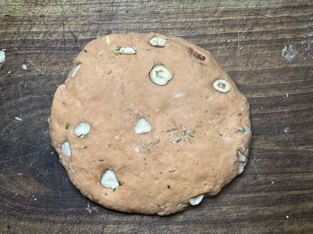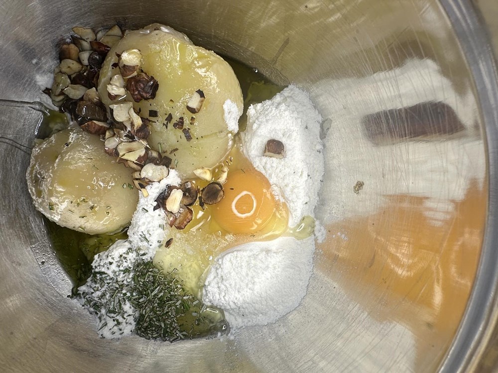 Prvo napravite tijesto za kušin na sljedeći način. Skuhajte krumpir u kori da bude mekan. Ogulite zatim koru od krumpira i stavite ga u zdjelu. Dodajte jušnu žlicu maslinovog ulja, jednu čajnu žlicu cvijeta morske soli, pola jušne žlice meda, trećinu čajne žlice crnog friško samljevenog papra, dva svježa jaja (bez ljuske naravno), 4 do 5 jušnih žlica brašna, sitno nasjeckane svježe iglice ružmarina od jedne grančice, 7 dkg prženog lješnjaka nasjeckanog na komadiće.