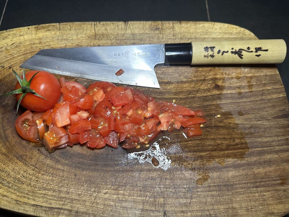 U plitkoj manjoj tavi, na zagrijanom maslinovom ulju i na srednje jakoj vatri, pržite uz miješanje cherry pomidore, listove bosiljka, listove mente, trećinu čajne žličice crnog friško samljevenog papra i prstohvat cvijeta morske soli. Nakon 5 minuta maknite tavu sa izvora topline.