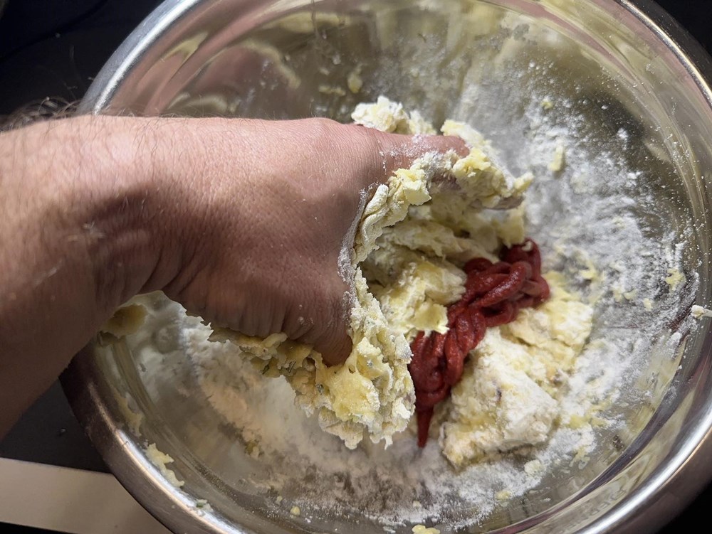 Sve ovo u zdjeli rukama dobro izmiješajte dok ne dobijete gustu i kompaktnu smjesu izgledom i opipom poput tijesta za pizzu. Možete po potrebi dodati još malo brašna ako vam se smjesa i dalje lijepi za ruke. Od dobivenog tijesta napravite kuglu, nešto veću nego li je loptica za golf, pa ju onda dlanom prignječite da dobijete oblik polpete.