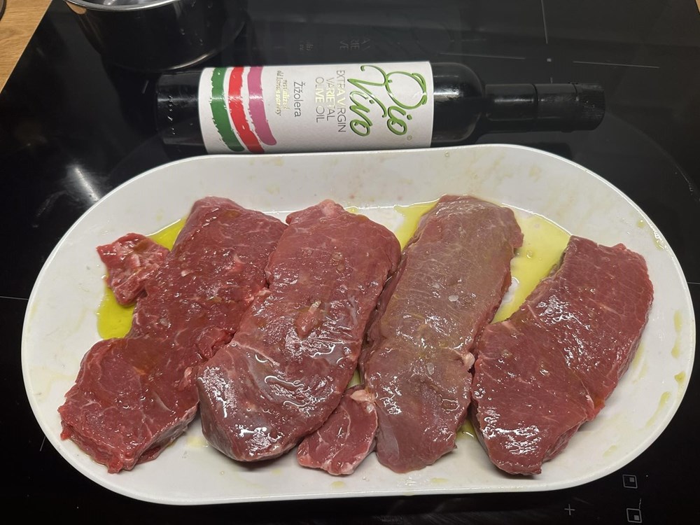 Ramstek razrezati u 4 odreska po cca 25 dkg svaki. Zatim očistiti odreske od preostalih žilica. Ramstek premazati maslinovim uljem i sasvim malo posoliti… cca jedan prstohvat po odresku…