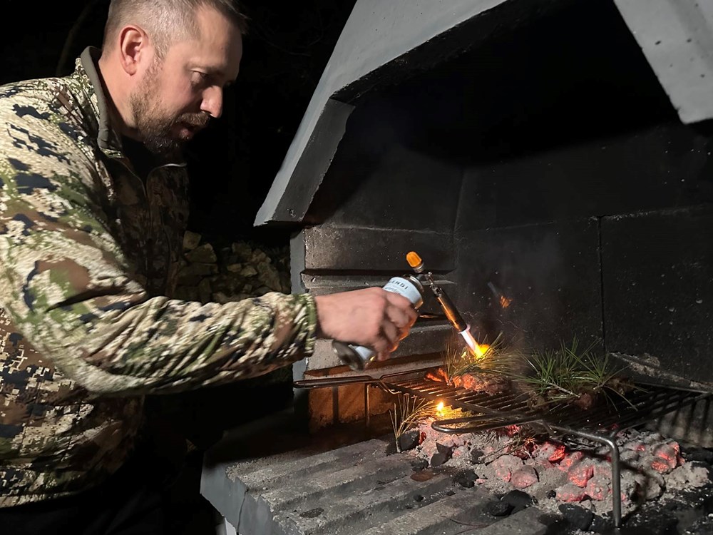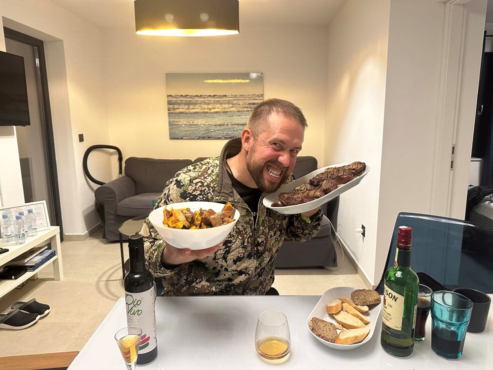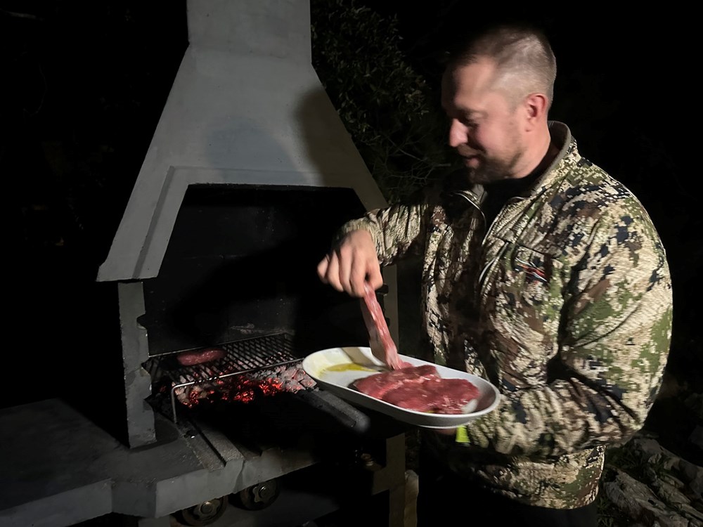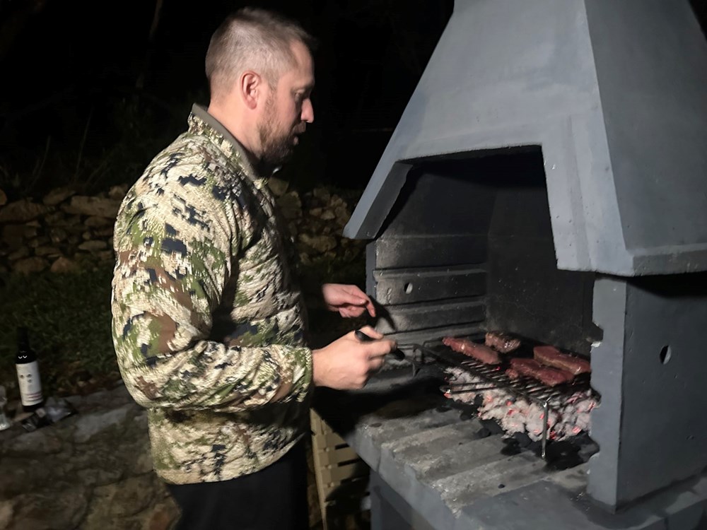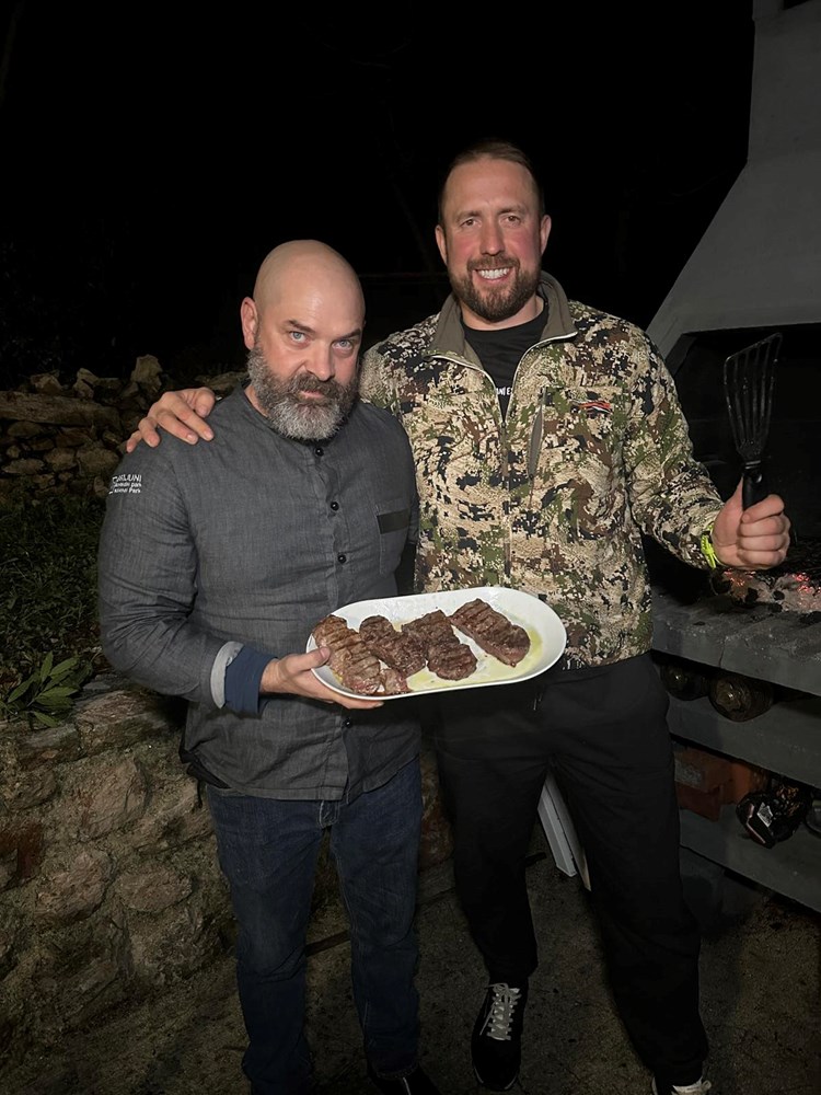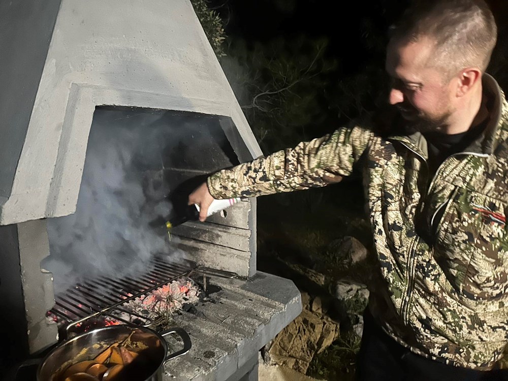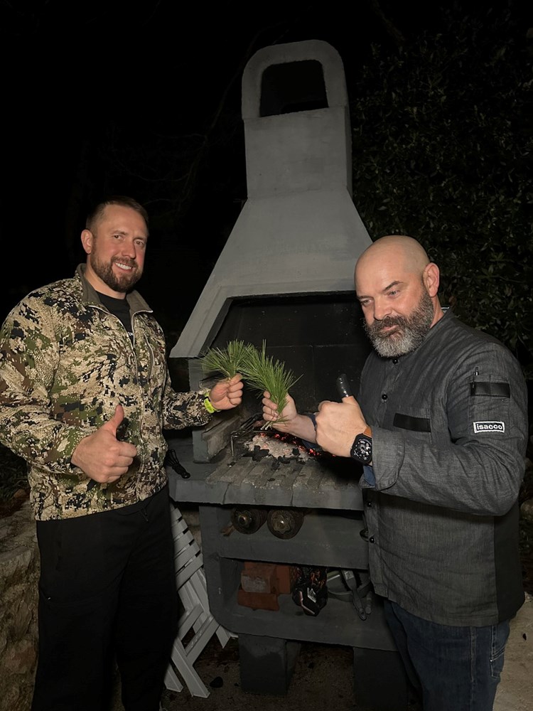 Vrlo smo se brzo složili da odradimo jedan jednostavan i konkretan recept zajedno. Dogovor je bio sljedeći: ja palim roštilj, on započinje s pečenjem ramsteka na svoj način, dodaje na njega whiskey i papar, ubacujemo zajedno borove pinove iglice po mesu i vatri, i onda ja bacam batat na vatru i dimim ga lovorovim listovima: "We will make this dish as the autors of half and half" … Govorim ja njemu na lošem engleskom, uokvirenom u slavenski naglasak , a on mi potvrdno odgovara gromoglasnim smijehom i medvjeđim stiskom ruke. Dakle… Što čekamo? … Zakuhajmo nešto … Yhaaaaaa!