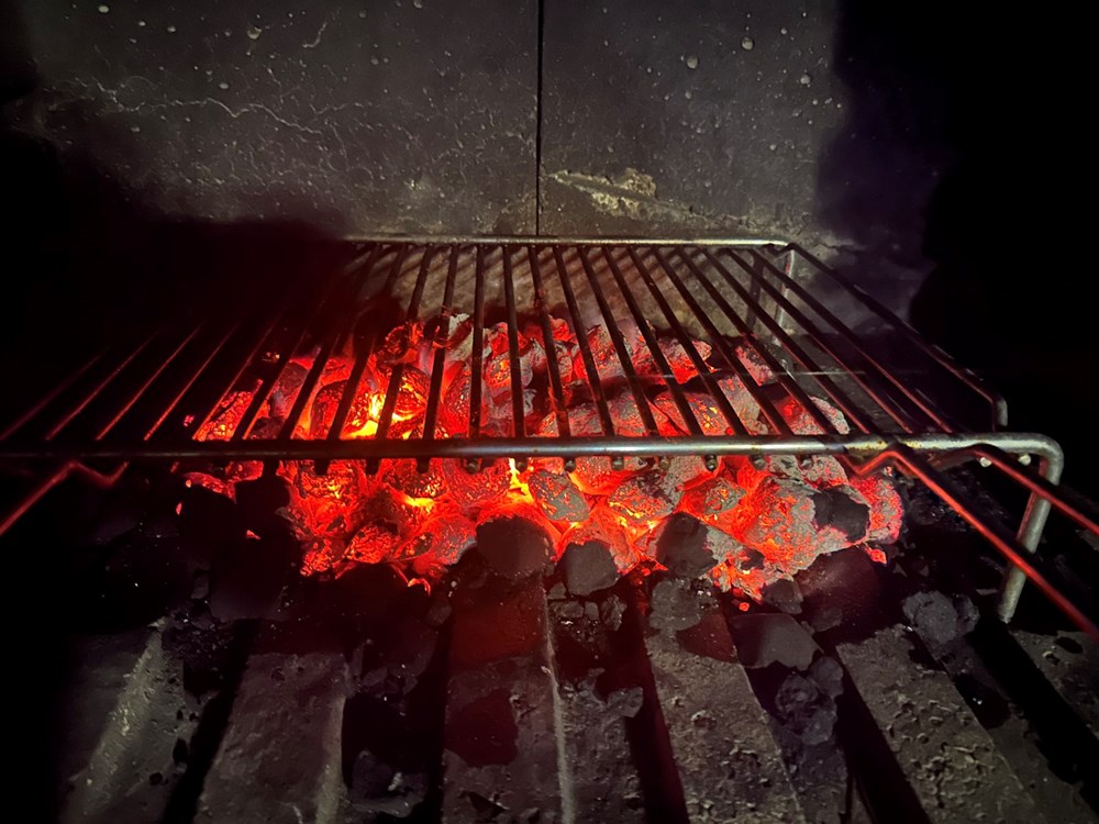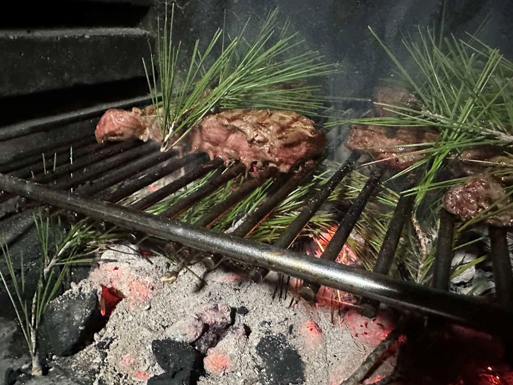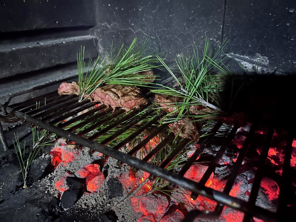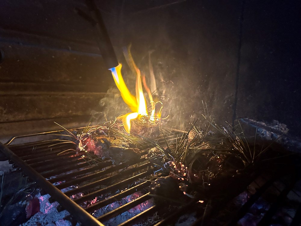 Unutar te 3 do 4 minute učiniti sljedeće: površinu mesa lagano poprskati s jednim dcl whiskeya . Kada alkohol kroz dim nakon cca 30-ak sekundi ishlapi iz mesa, popapriti usitnjenim crnim paprom, cca po prstohvat po odresku. Zatim na užareni ugljen i po odrescima pobacali iglice bora pina. Temperatura užarenog ugljena zapalit će borove iglice i putem dima koji izlazi iz njih ubacit će u strukturu mesa svoju esenciju. Iglice koje se nalaze na površini mesa zapalite kuhinjskim ili džepnim brenerom i plamen će natjerati iglice da ispuste dimnu esenciju u meso. Nakon što su iglice izdimile svoje i po isteku 3 do 4 minute, maknite meso od toštilja. Ramstek obavezno pustite cca 7 minuta da odstoji prije konzumacije da smiri uzavrele sokove unutar sebe i upije ih u strukturu svojeg mesa i kod rezanja ti sokovi ne cure na tanjur.