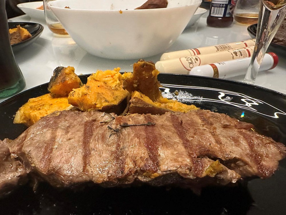 Ramstek i batat poslužiti na velikome plitkom tanjuru. Ja bih još batat i ramstek prelio smjesom maslinovog ulja u kojemu se nalazi jušna žlica soka limete i pola usitnjenog ljutog feferona. To bih ja napravio i moj kompanjon Konstantin, vi to ne morate, sasvim je dobro i ovako bez umaka i preljeva… Dok iz strukture mesa lagano uz dim izlazi miris pečene junetine s mirisom mediteranskog pina, a iz batata slatkasti miris lovora… Dobar vam tek dragi moji ljudi, neka vas avantura prati na svakome koraku… Vaš Outlaw.
