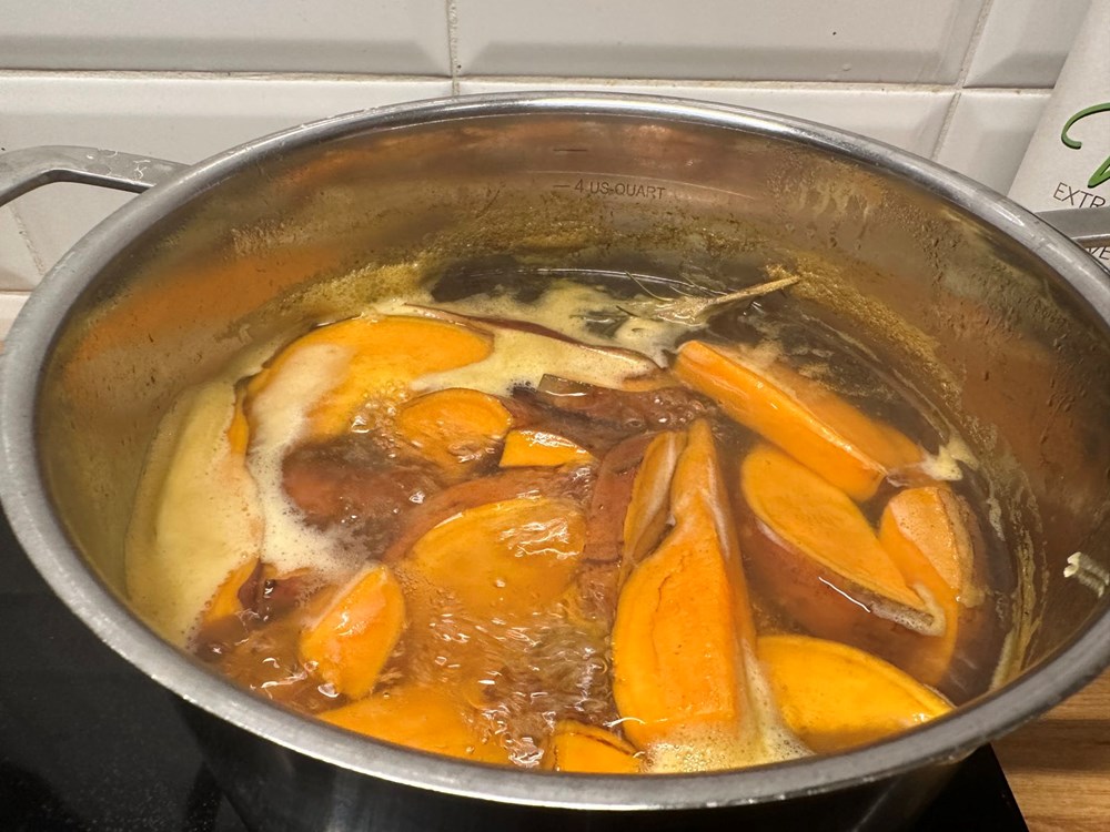 Istovremeno kada smo zapalili vatru u lonac sa kipućom slanom vodom, staviti kuhati batat narezan na veće kriške i odmah ubaciti 4 grančice sviježeg ružmarina. Nakon 15 ak min izvaditi batat iz vrele vode ocijediti ga i "baciti" na roštilj, na gradele odmah nakon što smo maknuli medo s vatre. Ispod batata ubaciti 20-ak listova svježeg lovora koji će uslijed visoke temperature uz višestruko pucketanje osloboditi svoju aromu putem dima koji će ući u strukturu batata. Zašto smo sve ovo napravili batatu? Prvo smo ga kuhali na ružmarinu pa je dobio mekoću i aromu. Onda smo ga stavili na vrele gradele i dimili na lovoru i dobili smo sljedeće: batat je u svojoj unutrašnjosti mekan i sočan s blagom aromom ružmarina, dok je na svojoj površini hrskav s blagom aromom lovora.
