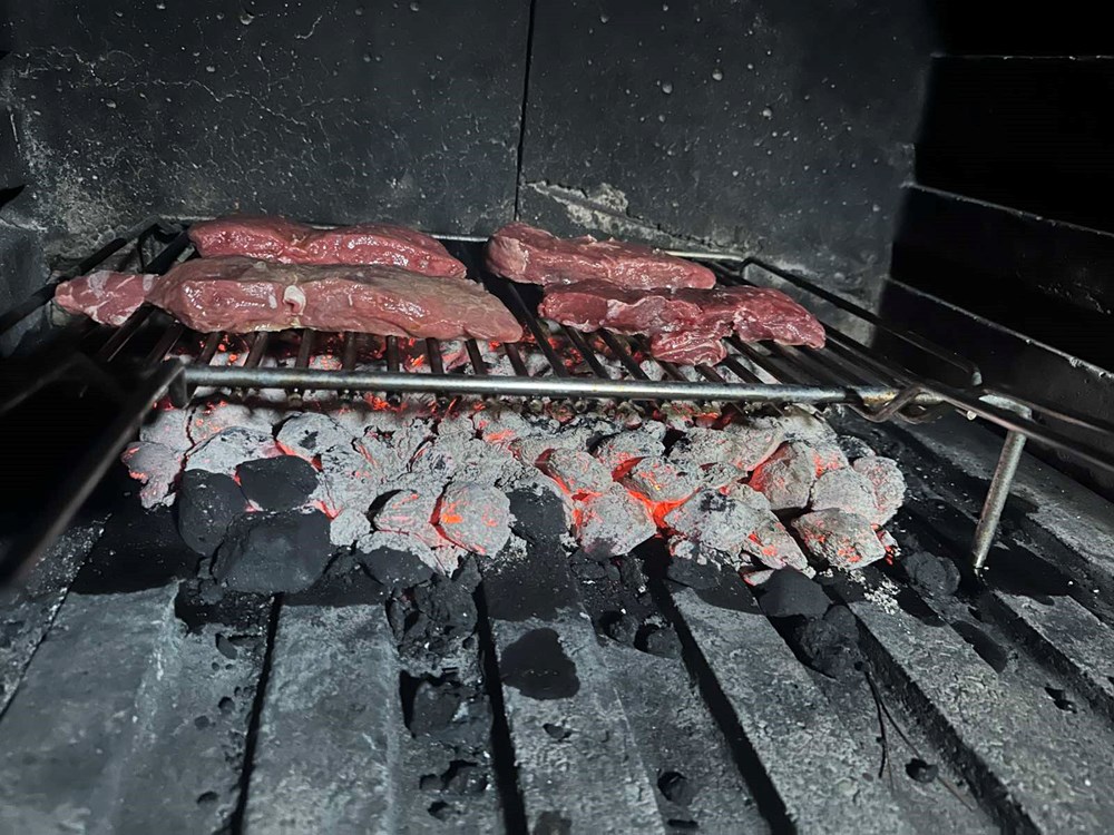 Zatim pustiti ramstek da odleži jedan sat na sobnoj temperaturi. U međuvremenu zapaliti roštilj i dodati ugljen. Kada se ugljen užari, staviti gradele "na vatru" koje smo prethodno premazali maslinovim uljem. Gradele na užarenom ugljenu pustiti minutu-dvije da "odime svoje", pa zatim staviti ramstek na gradele. Odreske peći cca 4 do 5 minuta na jednoj strani pa prije okretanja još jednom lagano cvijetom morske soli posoliti tu stranu i okrenuti meso. Drugu stranu ramsteka peći 3 do 4 minute.