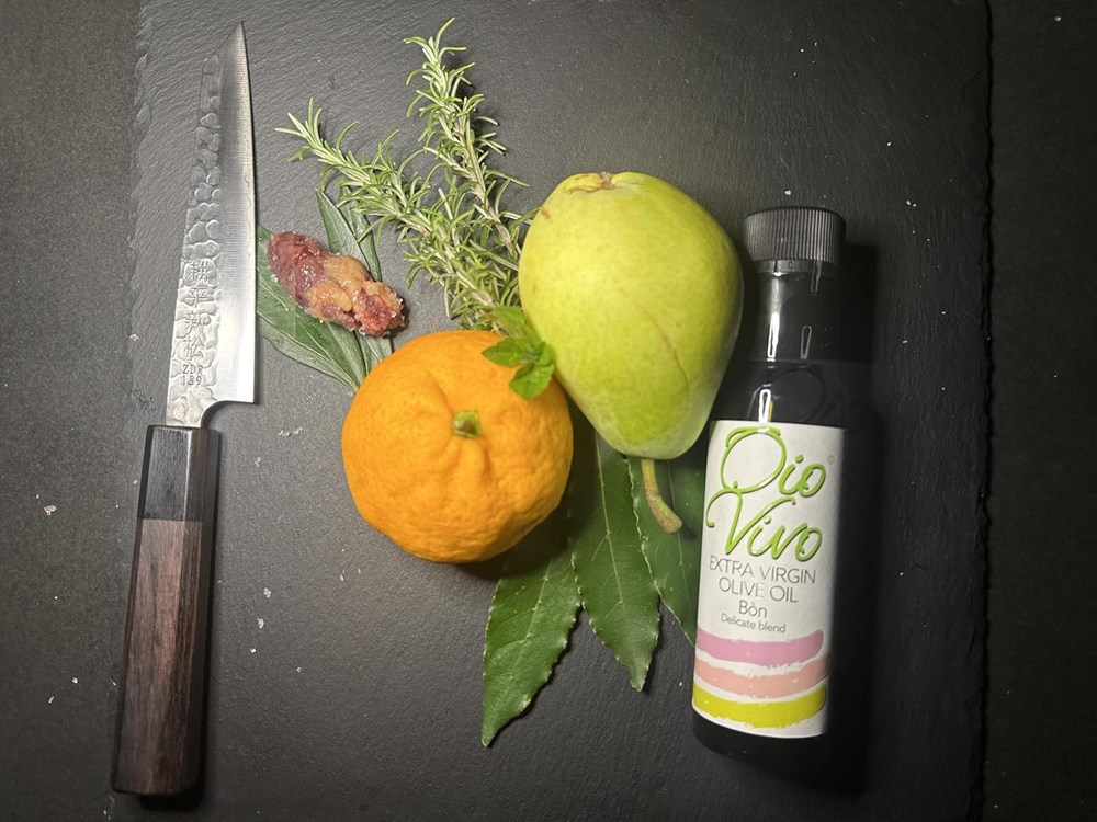 U malu poluduboku zdjelicu na dno stavite dvije do tri jušne žlice šalše od mandarine, na šalšu od mandarine stavite polovicu kruške. Na krušku u rupicu od košćica stavite srce od pilića. Pored srca od pilića stavite sviježi kistićem masline i nekoliko iglica svježeg ružmarina…