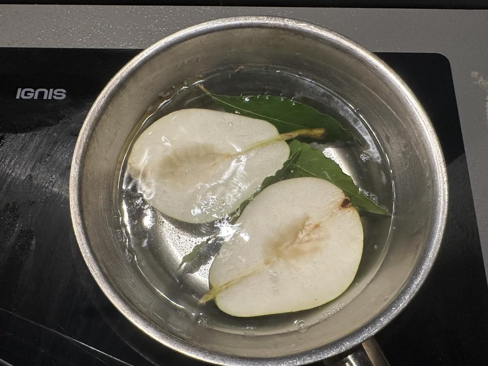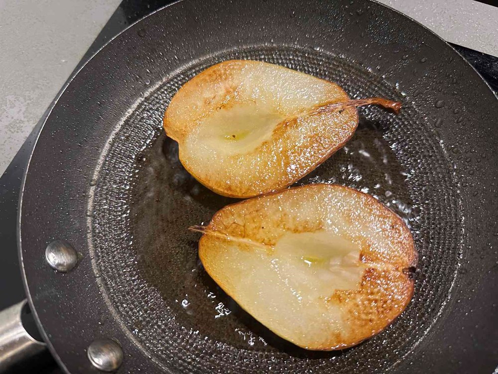 Drugoga dana učinite sljedeće: krušku razrežite na pola i izvadite dio s košćicama, mandarinu ogulite i razdijelite na kriške. Pileće srce izvadite iz frižidera, krupne soli i ružmarina. Očišćenu polovicu kruške stavite u manji lonac s kipućom slanom vodom i 7 svježih listova lovora… Kuhajte 7 do max 10 minuta pa maknite s izvora topline. Zatim krušku zapržite dvije do tri minute sa svake strane u tavu na vrelome maslinovom ulju. Krušku nakon toga maknite sa izvora topline.