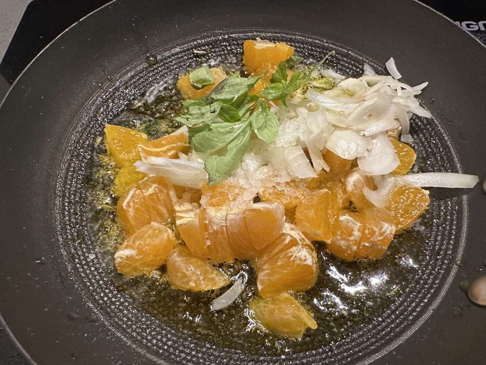 U drugoj manjoj plićoj tavi na vrelome maslinovom ulju pržite narezane kriške mandarine, nasjeckanu polovicu luka i pet šest listova svježeg bosiljka uz konstantno miješanje 3 do 5 minuta. Po isteku vremena maknite tavu s izvora topline.