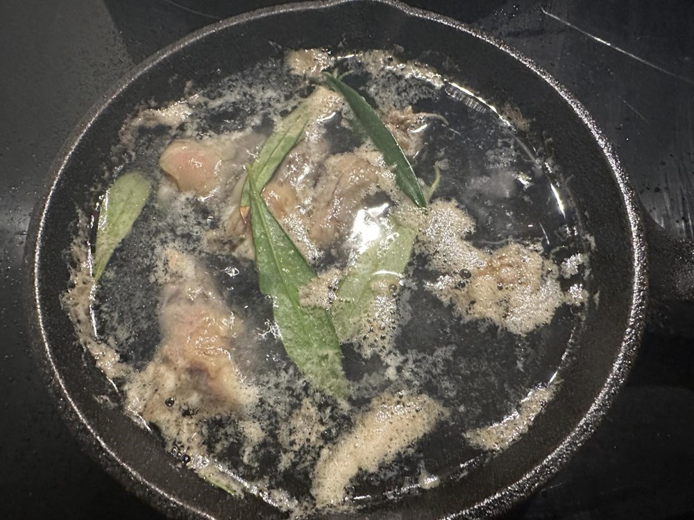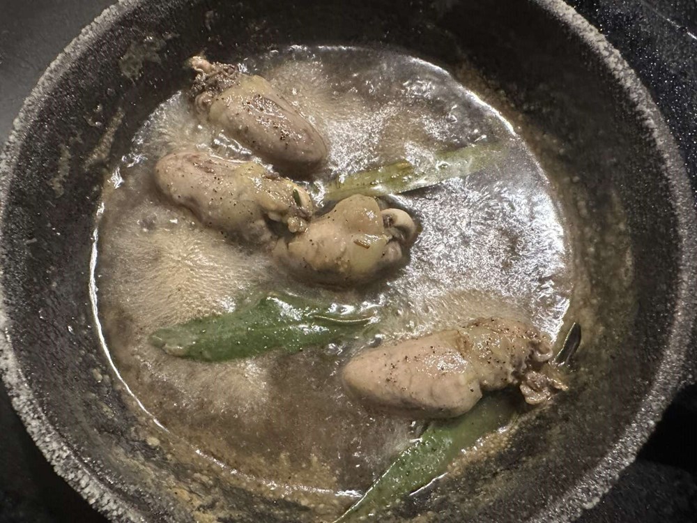 U plitkoj tavi u dva prsta kipuće vode (vodu ne morate soliti jer je srce odstajalo u soli) ubacite srce od pilića i sedam svježih listova masline. Kuhajte tako desetak minuta pa maknite s izvora topline.