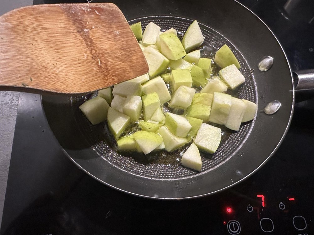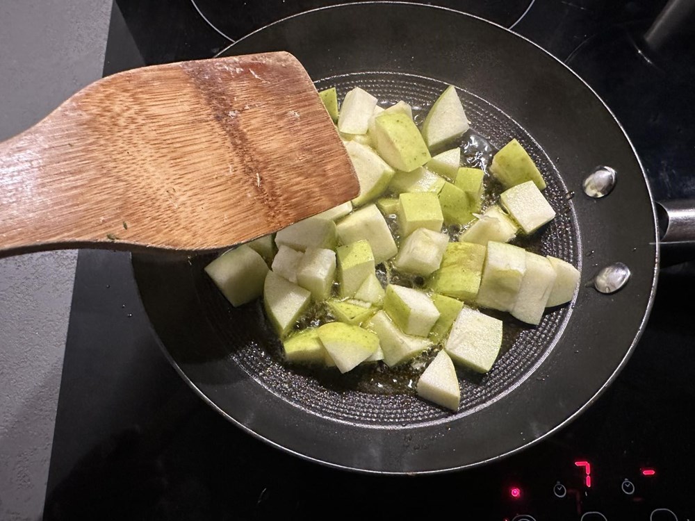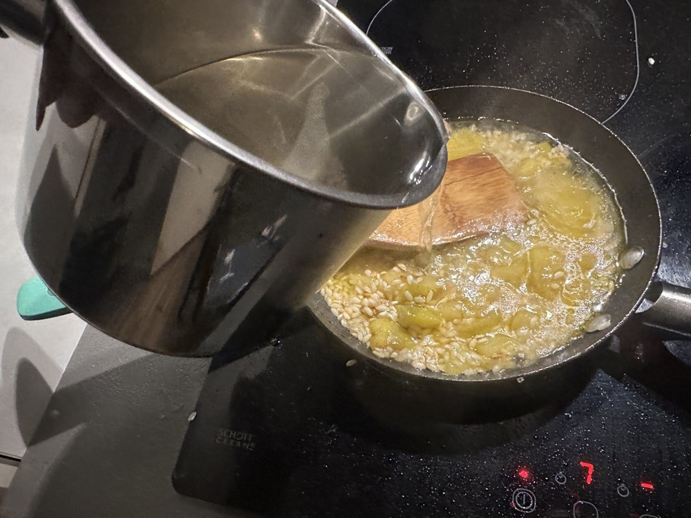 Jabuku očistite od košćica i narežite ju na kocke nešto veće od zrna graška. Sir Gran padano također izrežite na kocke nešto veće od zrna graška. U manjoj tavi na vrelome maslinovom ulju, uz konstantno miješanje pržite jabuku. Nakon cca 4 minute dodajte 60 g riže pa uz konstantno miješanje kad riža poprimi staklenkasti (za cca 2 minute)izgled dodajte malo vode i nastavite miješati, uz povremeno dodavanje vode, ne previše tek toliko da smjesa ostane gusta ali ne i vodenasta. Zašto dolijevamo vodu a ne neki povrtni temeljac?