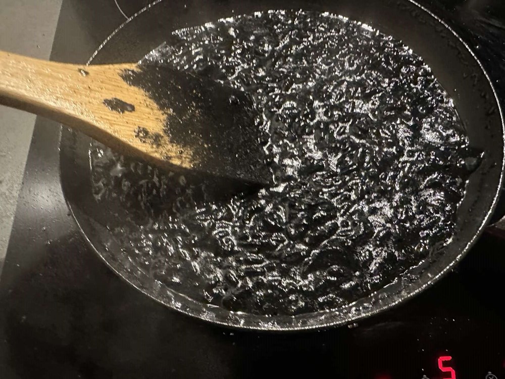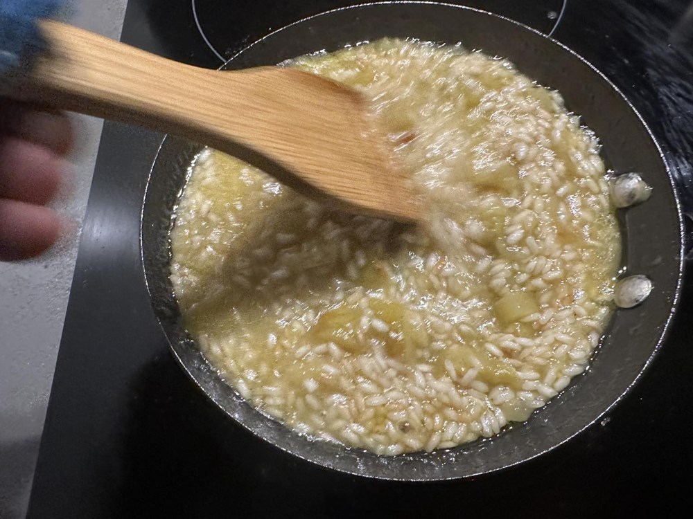 Iz razloga što želimo sačuvati blagi okus jabuke koji će se kasnije sljubiti sa okusom Grana padano sira i podići uz pomoć naribane limunove korice… dakle rižu i jabuku uz konstantno miješanje "kuhamo" na srednje jakoj vatri … nakon cca 10-ak minuta dodamo trećinu čajne žličice cvijeta morske soli pa nastavimo miješati… Pet minuta nakon dodavanja soli, riža bi trebala biti kuhana na nekih 75 do max 80 % , a jabuka mekana i blago rastopljena po riži. O tu smjesu riže i jabuke nakon gore navedenih pet minuta dodamo punu jušnz žlicu crnila od sipe i nastavimo konstantno miješati… nakon 2 do 3 minute od miješanja s crnilom od sipe dodamo sir Grana padano i nastavimo miješati i kuhamo na temperaturi još minutu pa zatim maknemo tavu s izvora topline i ostavimo naš rižoto 5 do 7 minuta da malo "odmori".