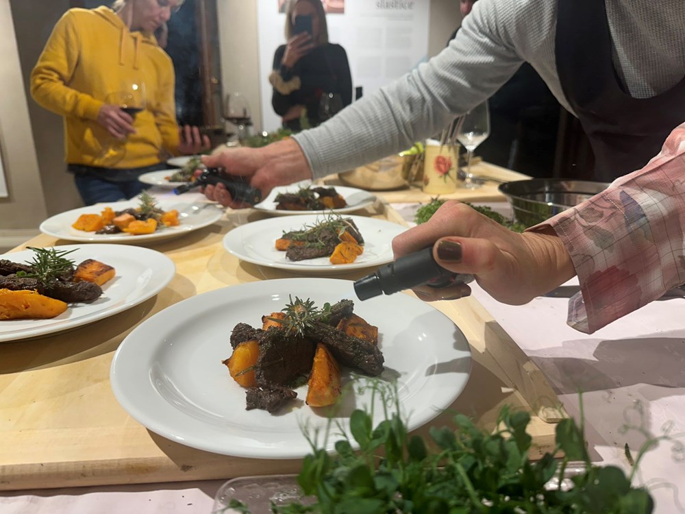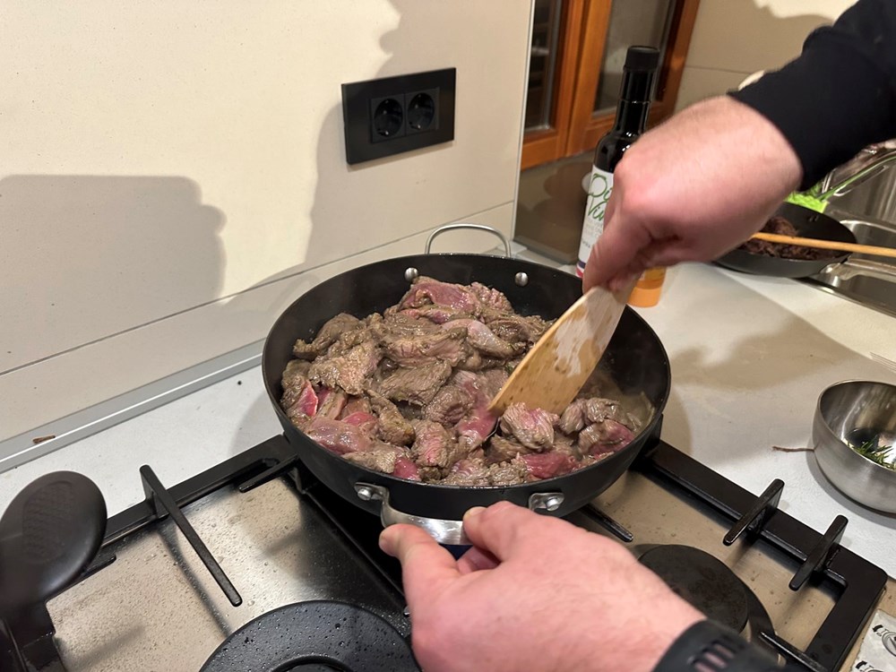 U pac staviti juneće meso. Nakon 12 sati meso izvaditi iz paca, izrezati ga na tanke trakice te ga peći na maslinovom ulju cca. 50 sekundi sa svake strane uz dodatak crnog friško samljevenog papra i Rossijev Cabernet Sauvignn 2019.