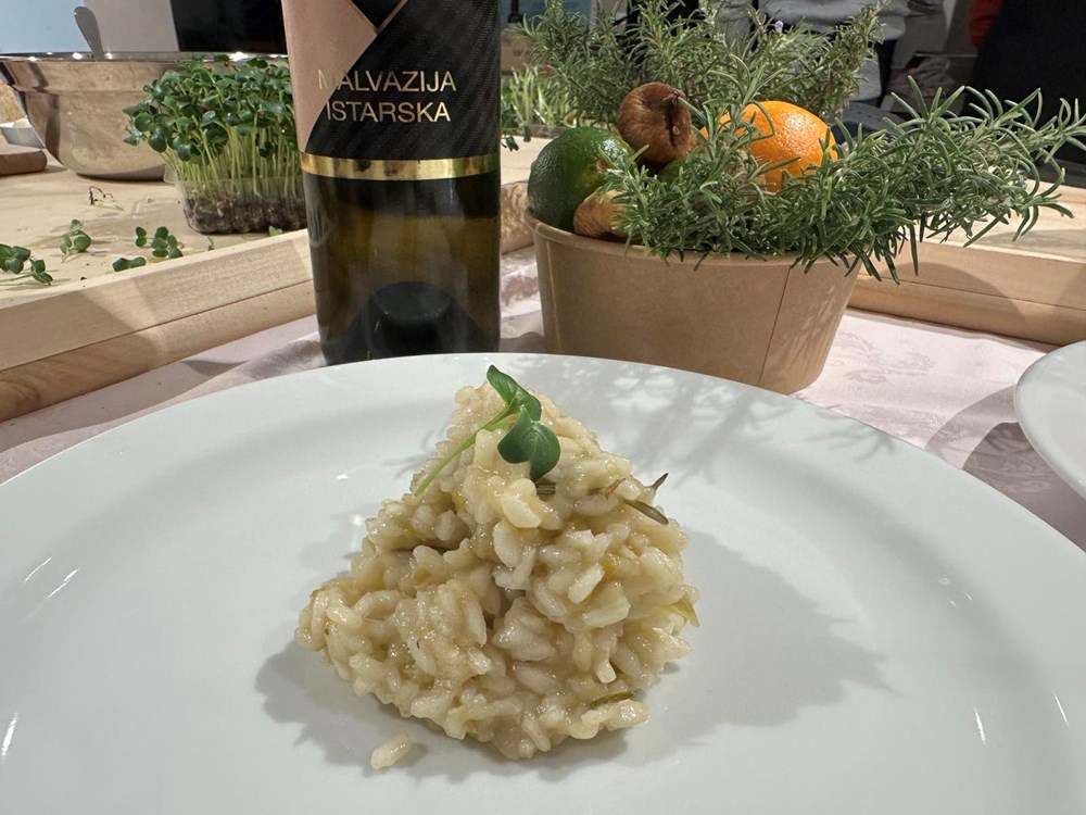 Kada kruška i jabuka počnu dobivati smećkaste tonove dodati u tavu rižu. Uz konstantno miješanje na srednje jakoj vatri nastaviti sa tostiranjem riže. Kada riža postigne staklenkasti izgled, dodati malo Rossijeve istarske malvazije, pa kad vino ishlapi uz konstantno miješanje dodati malo vode, crnog friško samljevenog papra, cvijet morske soli, konstantno miješati i dodavati vodu pomalo tek toliko da riža nebude suha.