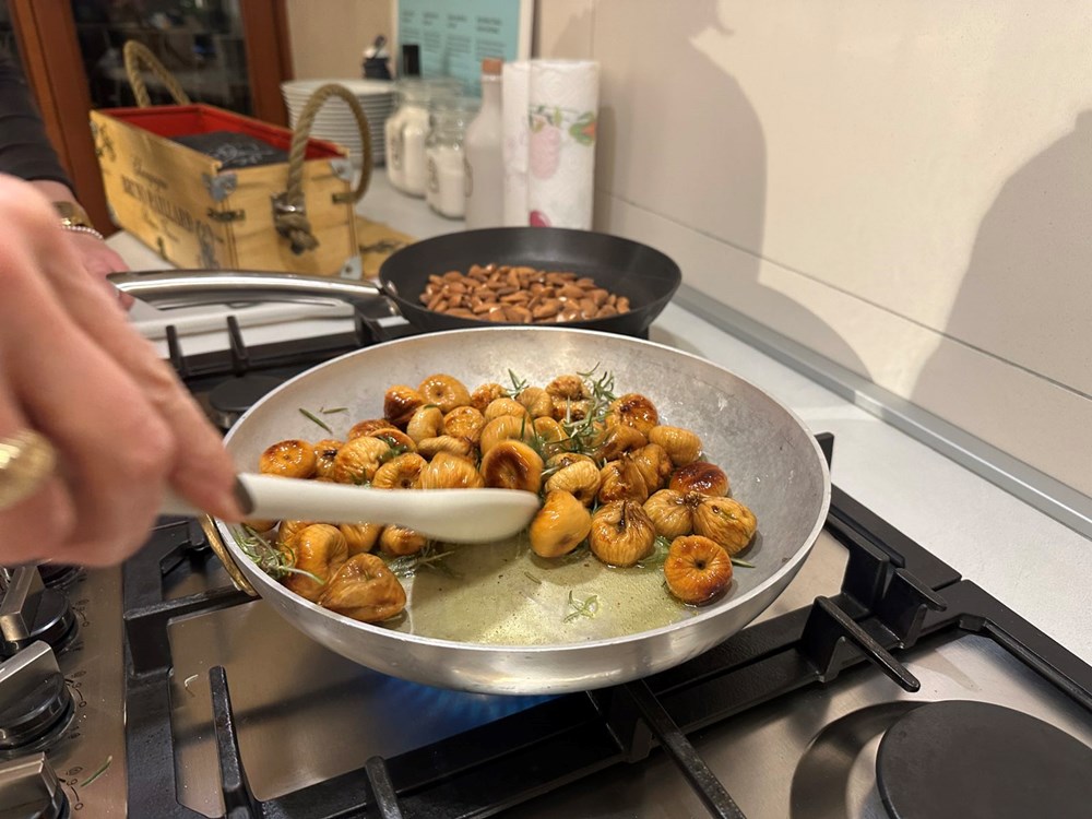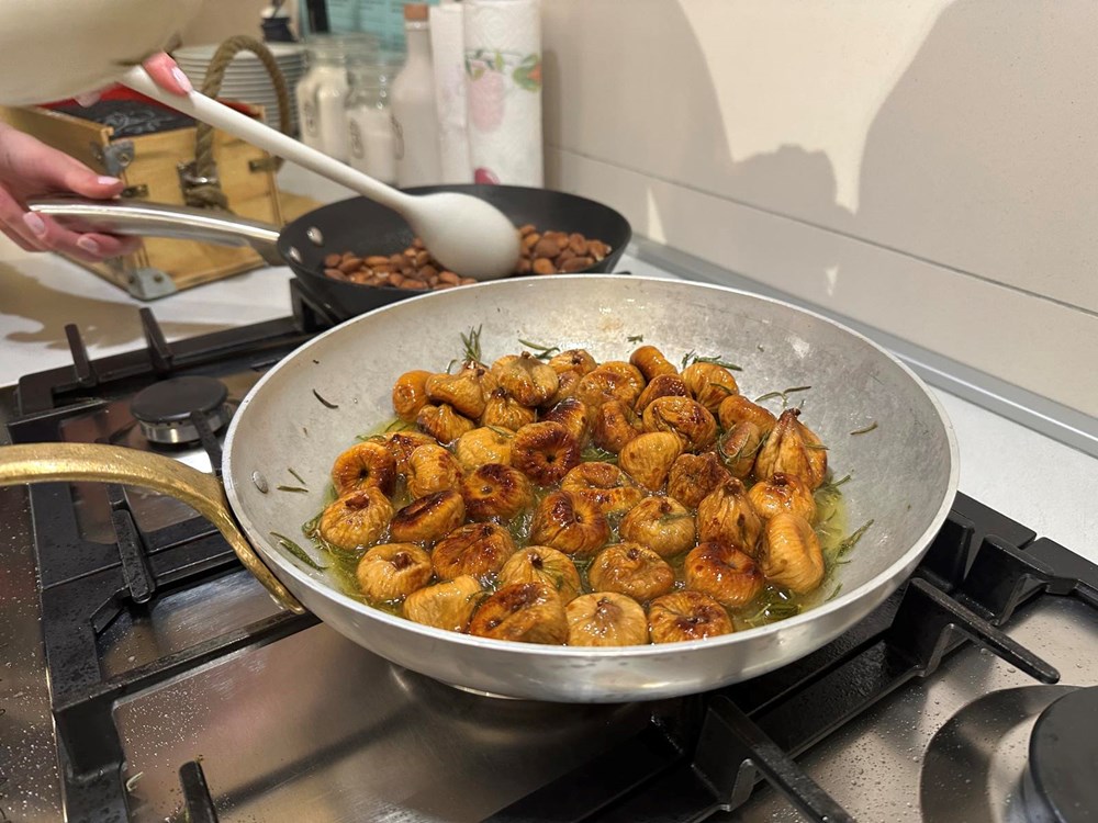 Dinstati suhe smokve na maslinovom ulju, ružmarinu, medu i malo vode. Paralelno s time "na suho" u manjoj vreloj tavi istostirati badem te nakon 3 do 4 minute maknuti tavu s izvora topline.