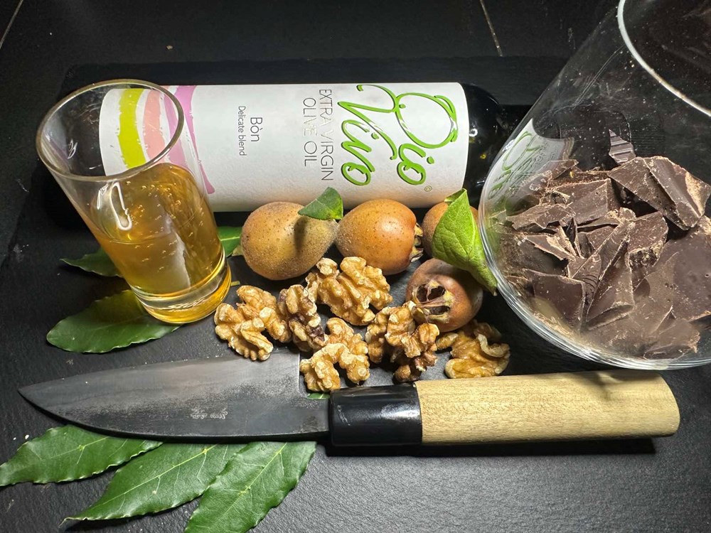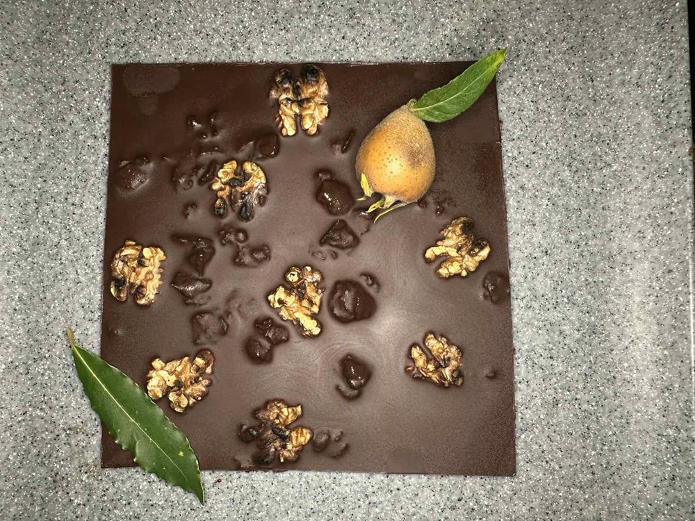 Raspravljamo filozofski raspoloženi o tonovima okusa oskoruše i što bi se sve moglo s njome spraviti… Prošli smo svakakve ideje ali meni se najviše svidjela ona najjednostavnija da napravim od mušmule čokoladu. Njen okus jednostavno mi se činio savršenim za sljubljivanje s tamnom gorkasto slatkom čokoladom… a da malo "začinim cijelu priču" odlučio sam dodati i orahe koji su također rasli na drvu iz vidulinskog dvorišta, lovor sa svojim blagim okusom oplemenjen B vitaminom, med i maslinovo ulje…