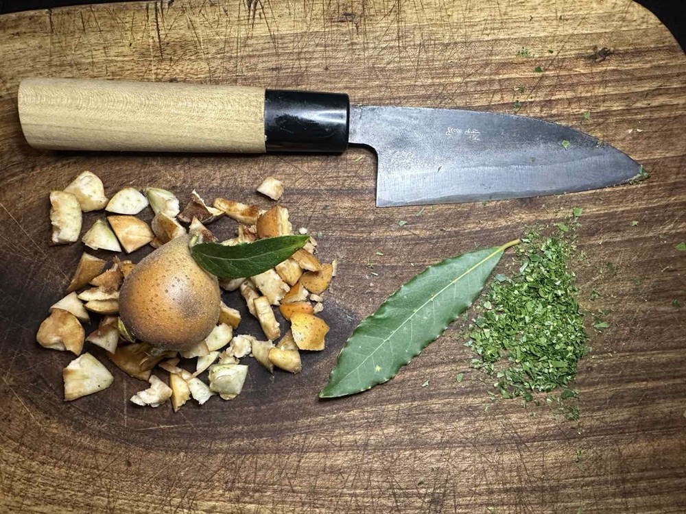 Oštrim nožem razrežite oskoruše na dijelove nešto veće od zrna graška i odstranite koštice. Listove svježeg lovora usitnite da budu gotovo poput praha (ne brinite, vi to možete… već nakon pet minuta konstantnog usitnjavanja lovor je gotovo prah).