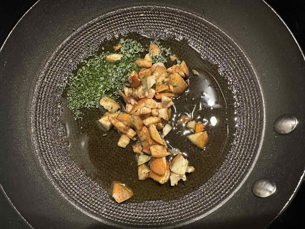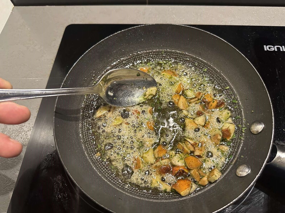 U manjoj i plitkoj tavi na zagrijanom maslinovom ulju na srednje jakoj vatri pržite komadiće oskoruše sa sitno nasjeckanim lovorom. Nakon tridesetak sekundi dodajte pola jušne žlice meda, pržite uz konstantno miješanje još neke tri do četiri minute, zatim maknite tavu od izvora topline.