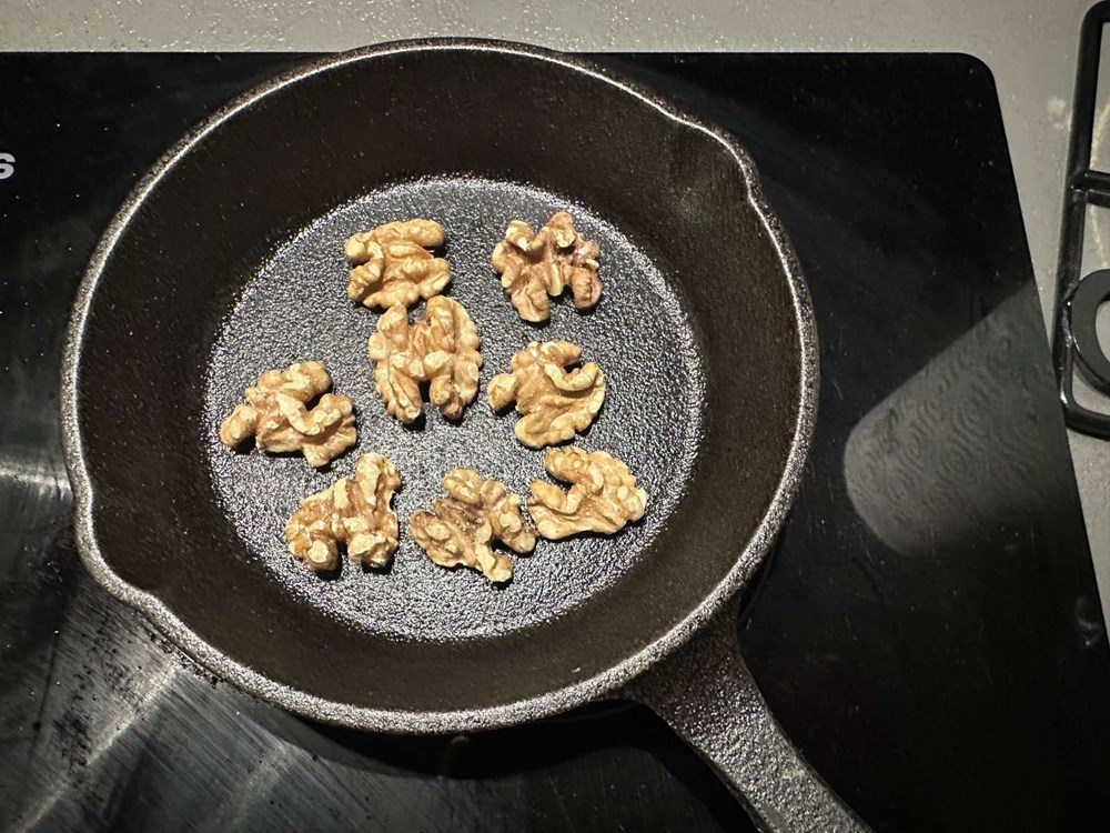 Na drugoj manjoj i plitkoj, već zagrijanoj tavi, na srednje jakoj vatri pržite orahe, otprilike minutu i pol s jedne pa minutu i pol s druge strane. Po isteku spomenutog vremena maknite tavu od izvora topline. U manji lončić stavite dva prsta vode na srednje jakoj vatri.