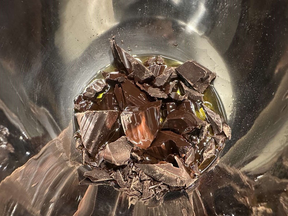 Kada voda u lončiću zakipi, na njega stavite okruglu metalnu zdjelu u koju stavite dvije jušne žlice maslinovog ulja, 25 dkg tamne čokolade za topljenje i pola jušne žlice meda. Kada se čokolada u zdjelici rastopi u nju ubacite oskorušu koju ste pržili na medu i lovoru.