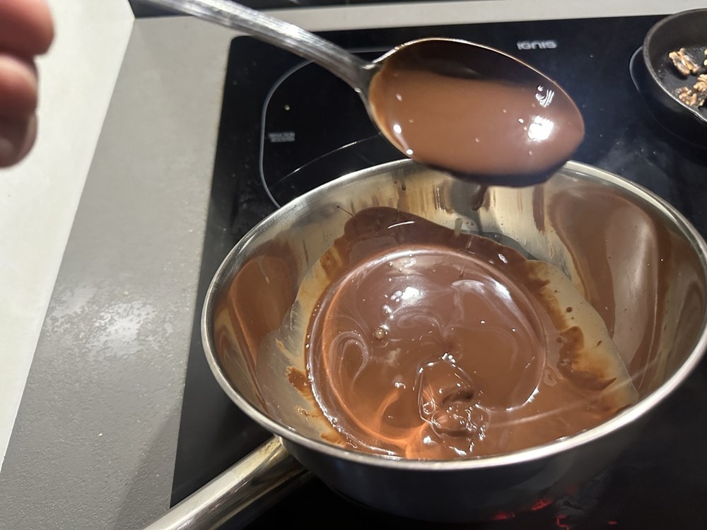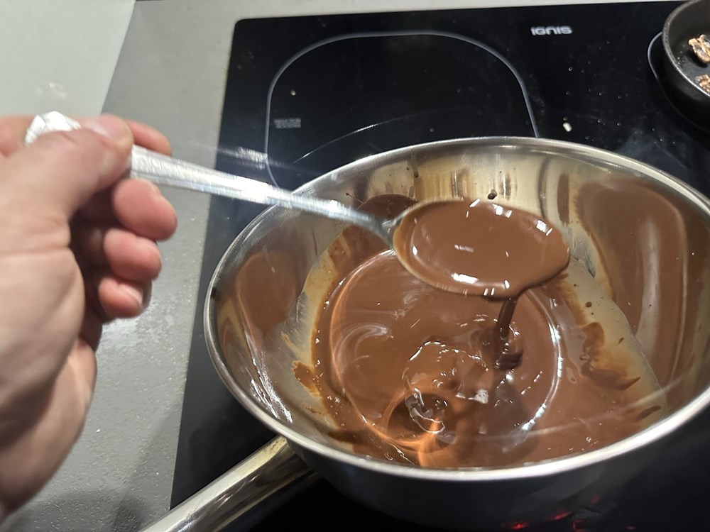 Čisti "pornfood" odnos… Kada ste dobili kompaktnu tekuću smjesu maknite zdjelicu s lončića i izvora topline i nastavite ju miješati sve dok se smjesa ne ohladi na nekih cca 37 stupnjeva Celzijevih. Kako ćete skontati da je čokolada došla na 37 stupnjeva ako nemate kuhinjski toplomjer? Tako što ćete prisloniti prednju stranu dlana na stijenku zdjelice i ako otprilike bude jednake temperature, to je to.