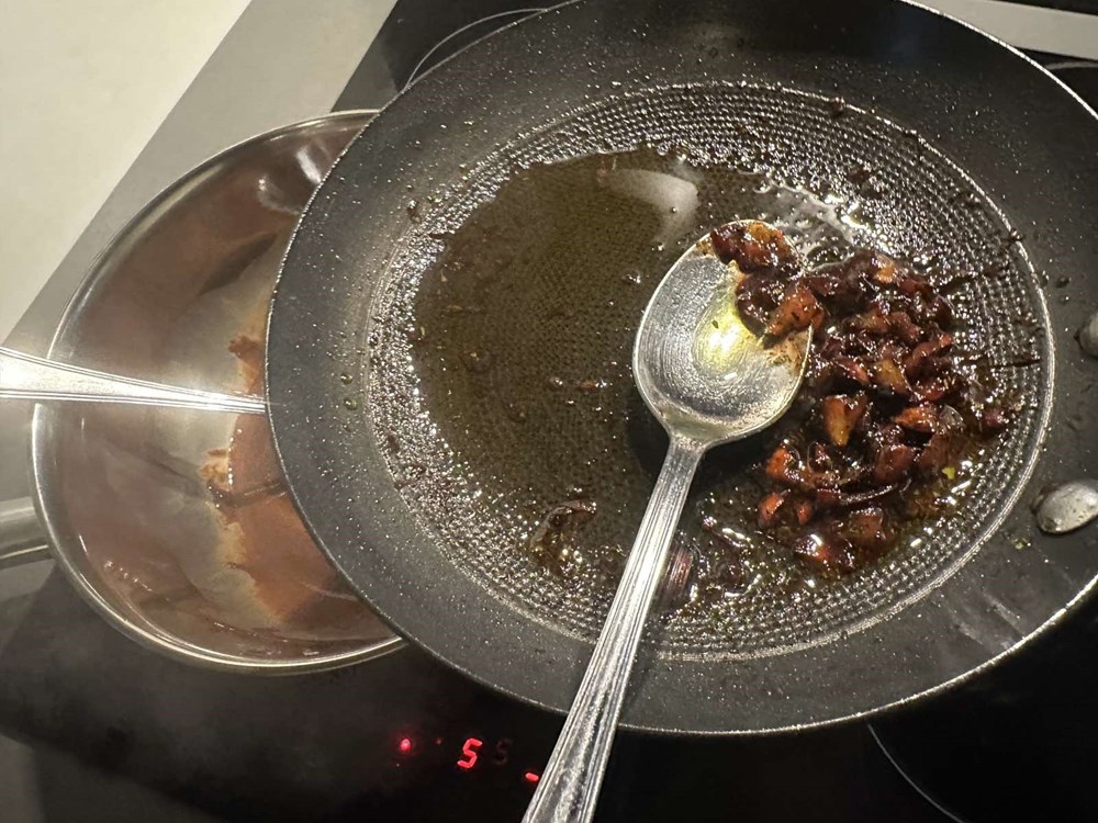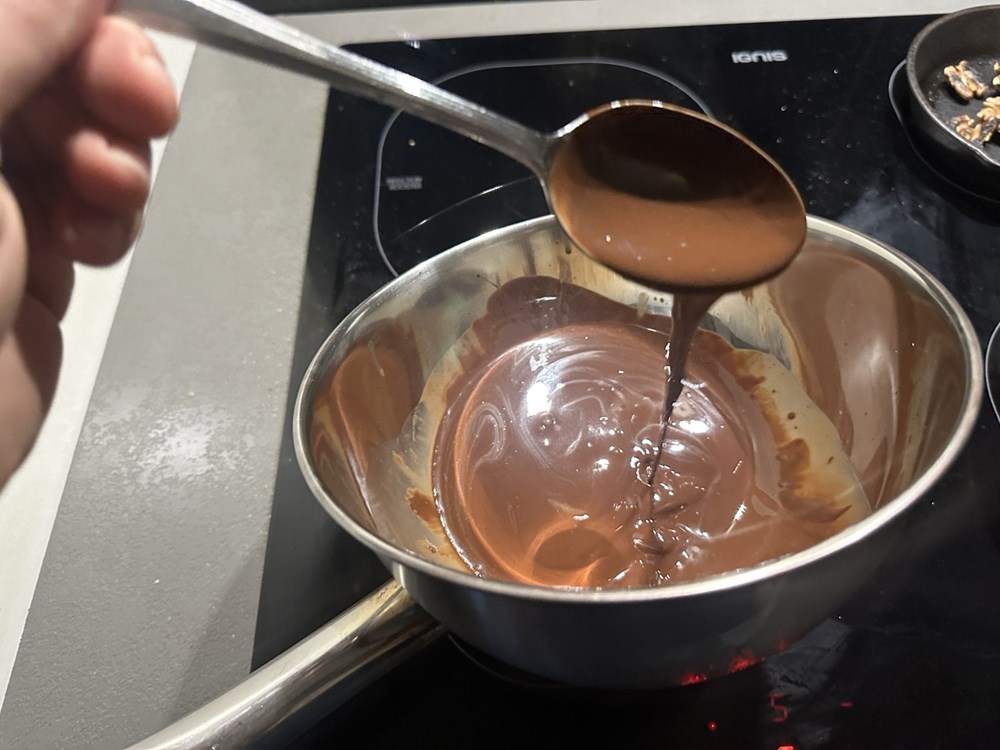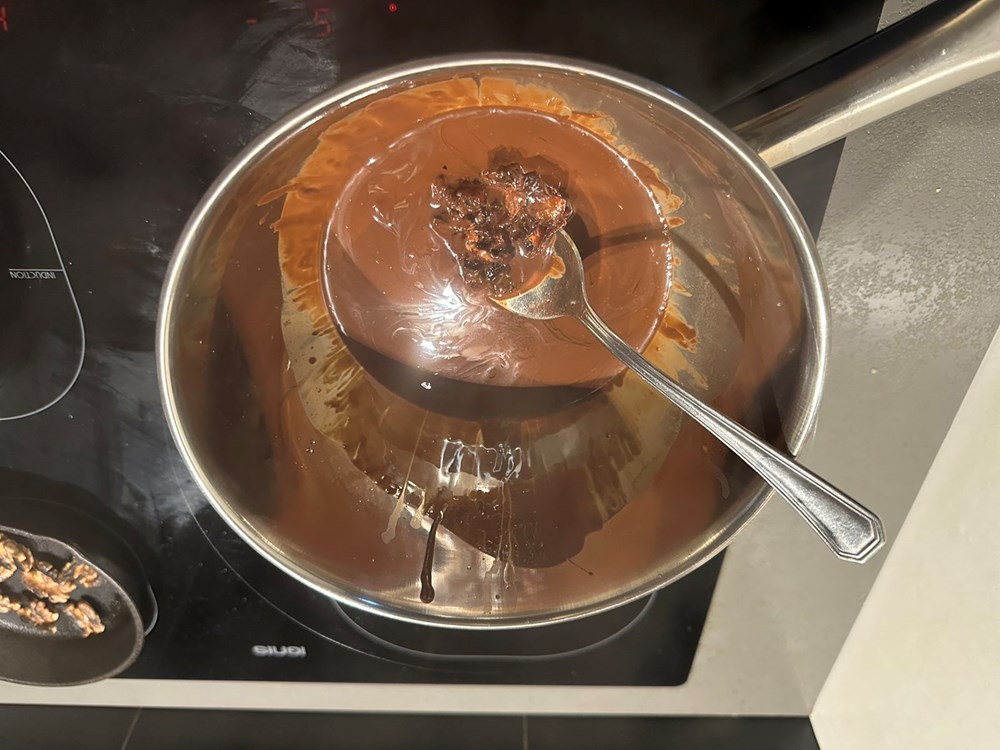 Pazite, kako smo ju karamelizirali medom, ona je, budući da je stajala desetak minuta, otvrdnula. Ali ništa ne brinite, ubacite taj "čvrsti, ali slatki sadržaj iz tave" u toplu i meku čokoladu i već nakon nekoliko trenutaka uz konstantno miješanje on će se sljubiti i otopiti u čokoladi.