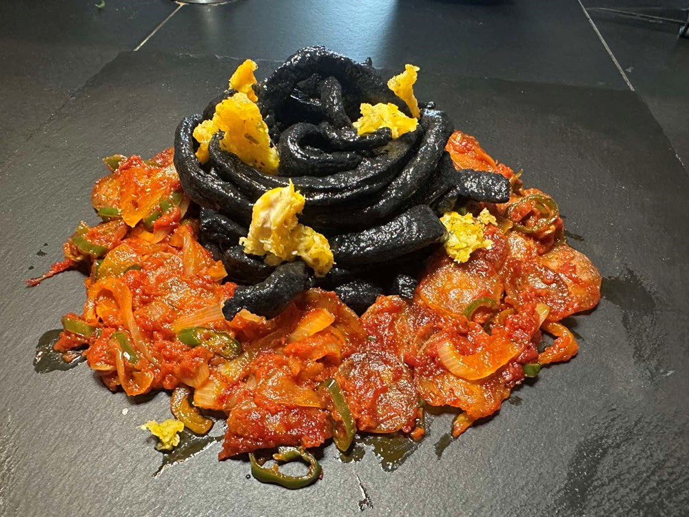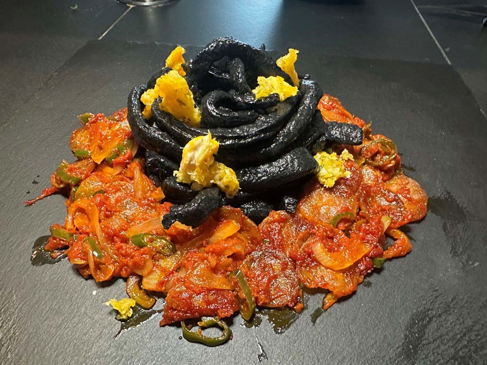 Na velikom plitkom i ravnom tanjuru prvo u oblik kruga stavite našu šalšu koju smo radili od domaće kobasice, koncentrata rajčice i ljutog zelenog feferona. Na tu šalšu po sredini na hrpu posložite naše crne rezance, a po njima pobacajte komadiće iz druge tave od sad već stvrdnutog žumanjka, ružmarina i sira Grana padano... I eto ga vaš je tanjur spreman zajedno s ovim jelom za konzumaciju. Jelo je štosa radi (tamni rezanci) namjerno dizajnirano i osmišljeno da izgledom izgleda odbojno i da asocira na nešto u što nikako ne biste željeli ugaziti šećući se prirodom, dok ova dva polutvrda umaka po svojoj boji asociraju na jesensko / zimsko šumsko suho lišće… međutim već nakon prvog zalogaja na vašem se nepcu oslobađa eterika maslinovog ulja, ružmarina, zaokružena okusom Grana padana i domaće kobasice a na vašem se licu pojavljuje osmijeh…