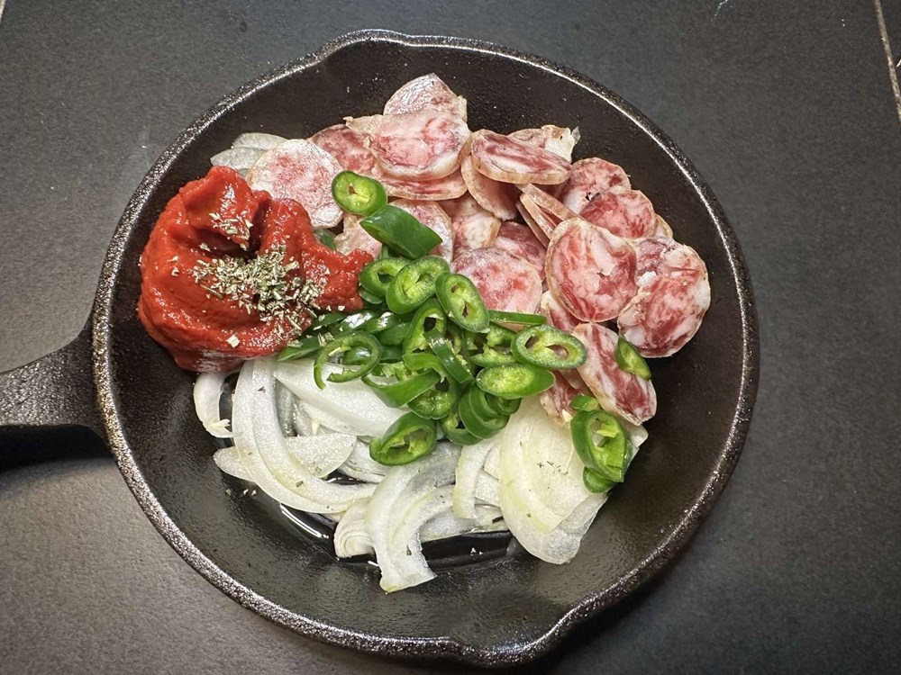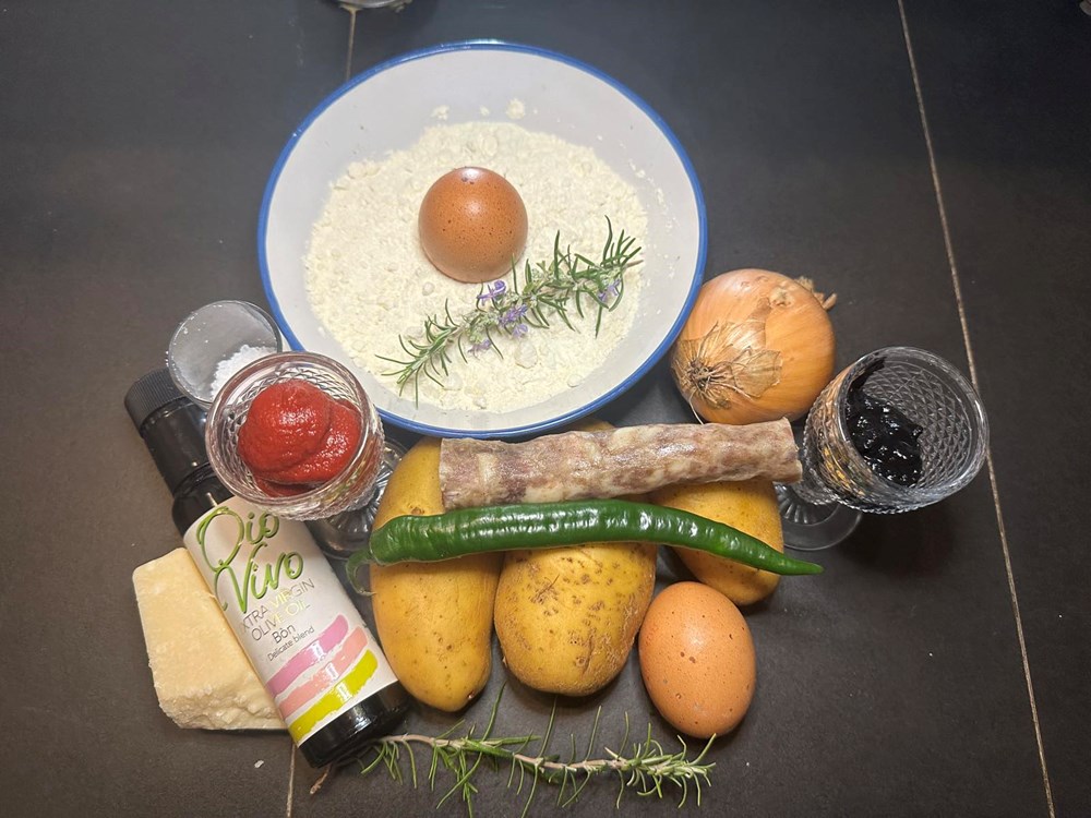 U drugoj manjoj plitkoj tavi na srednje jakoj vatri pržite domaću kobasicu narezanu na kolutiće, pola glavice luka narezane na tanke trakice, jedan ljuti feferon narezan na kolutiće, jednu jušnu žlicu koncentrata rajčice, jednu jušnu žlicu maslinovog ulja, pola čajne žličice friško sitno narezanog ružmarina, trećinu čajne žličice cvijeta morske soli.