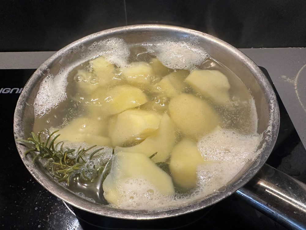 U kipuću slanu vodu s jednom žličicom maslinovog ulja i grančicom svježeg ružmarina stavite kuhati oguljeni krumpir. Nakon petnaestak minuta maknite lonac s izvora topline.