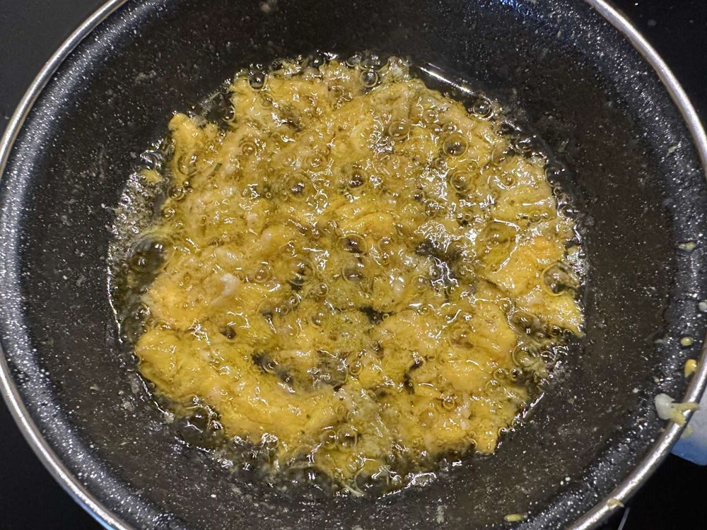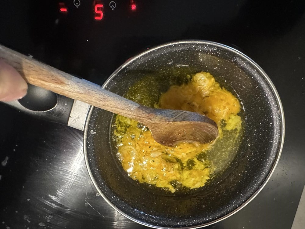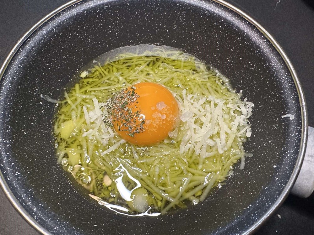 U malenoj plitkoj tavi na zagrijanom maslinovom ulju, na srednje jakoj vatri lagano ali konstantno drvenom kuhačom miješajte samo svježi žumanjak jajeta, cca pola čajne žličice usitnjenih ružmarinovih iglica i svježe naribani sir Gran padano. Miješajte tako na srednje jakoj vatri par minuta dok smjesa ne postane kompaktna te se počne zgrušavati. Maknite zatim tavu s izvora topline.