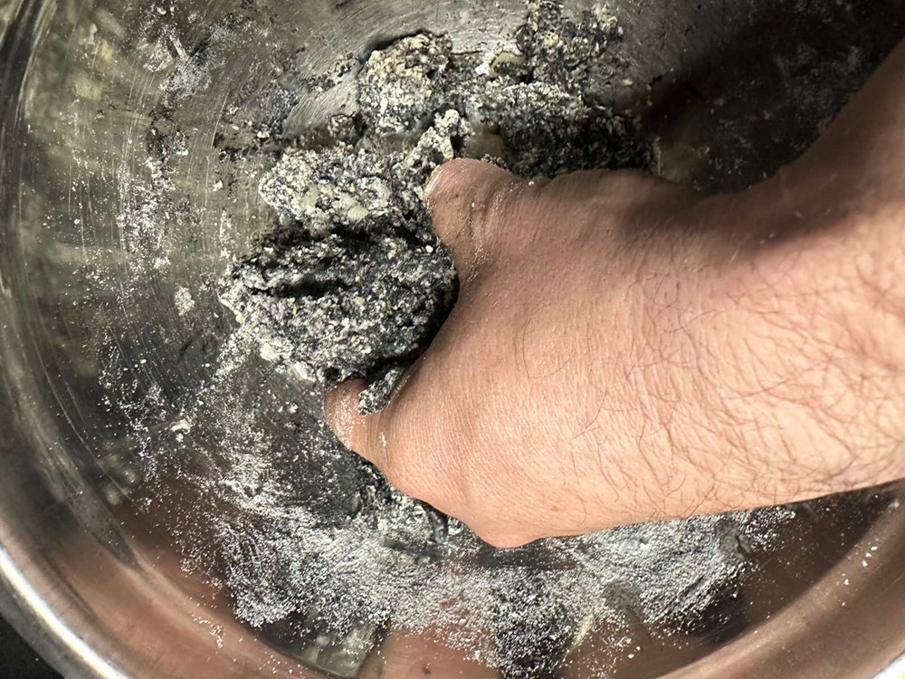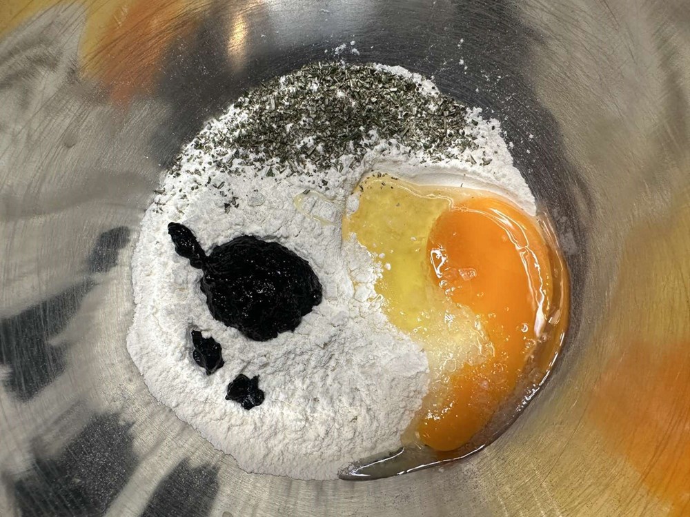 U veliku zdjelu stavite pet jušnih žlica brašna, jednu jušnu žlicu crnila od sipe, pola čajne žličice cvijeta morske soli, pola čajne žličice friškog sitno nasjeckanog ružmarina i sve ovo rukom počnite mijesiti dok se ne stvori kompaktna smjesa. U tu smjesu ubacite zatim kuhani krumpir i jušnu žlicu maslinovog ulja i sve to dobro umijesite rukom sve dok ne dobijete tamnu čvrstu kompaktnu smjesu od tijesta.